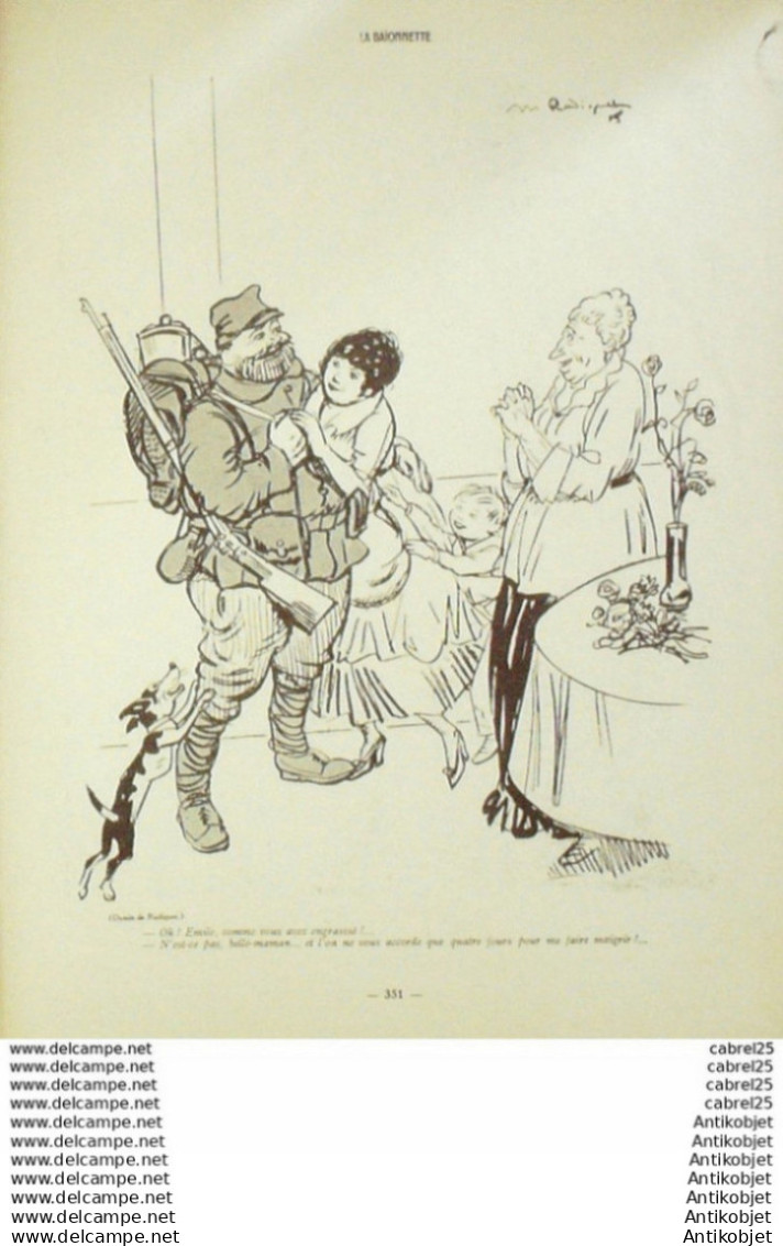 Periodique authentique de 16 pages richement illustrees en couleurs de caricatures humoristiques et satiriques fut cree l'origine "x la baionnette" le 23 janvier 1915 par le dessinateur Henri Maigrot, dit Henriot , collaborateur de L'Illustration et pere d'emile Henriot et il fournit l'essentiel des dessins, durant 24 numeros, jusqu'au 3 juillet. format 310x220. Il tire son nom de la baionnette et de l'expression charger la baionnette, la charge etait d'ailleurs son activite favorite puisque celui-ci, distribue aux poilus, se moquait de la betise des Allemands, ridiculisant par des caricatures le Kaiser Guillaume II ou le Kronprinz Guillaume de Prusse. Le magazine changea d'editeur le 8 juillet 1915, pour une nouvelle serie, des le 13 aout, s'appela La Baionnette. La maquette, la ferocite de certains dessins, ainsi que le choix des dessinateurs, rappellent L'Assiette au beurre