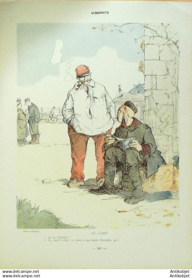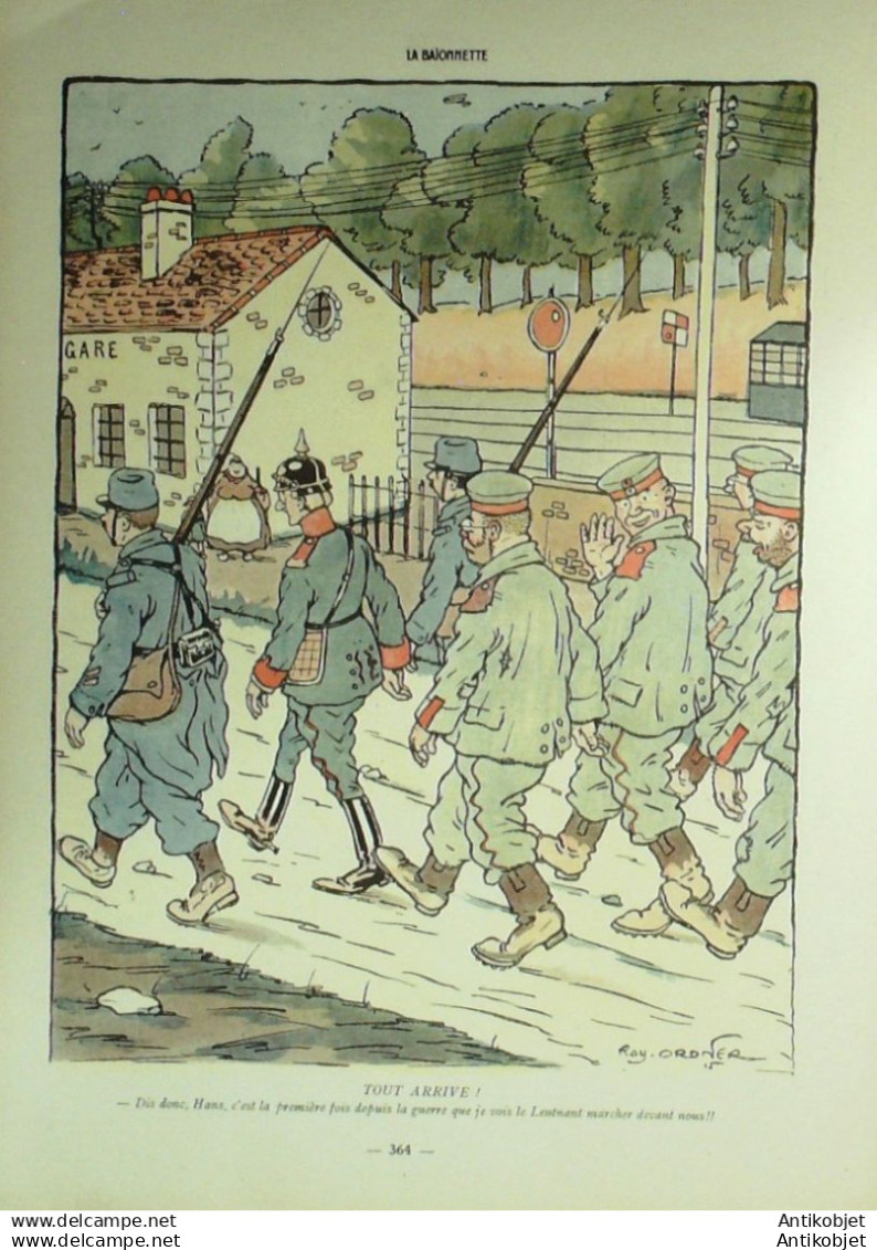 Periodique authentique de 16 pages richement illustrees en couleurs de caricatures humoristiques et satiriques fut cree l'origine "x la baionnette" le 23 janvier 1915 par le dessinateur Henri Maigrot, dit Henriot , collaborateur de L'Illustration et pere d'xmile Henriot et il fournit l'essentiel des dessins, durant 24 numeros, jusqu'au 3 juillet. format 310x220. Il tire son nom de la baionnette et de l'expression charger la baionnette, la charge etait d'ailleurs son activite favorite puisque celui-ci, distribue aux poilus, se moquait de la betise des Allemands, ridiculisant par des caricatures le Kaiser Guillaume II ou le Kronprinz Guillaume de Prusse. Le magazine changea d'editeur le 8 juillet 1915, pour une nouvelle serie, des le 13 aout, s'appela La Baionnette. La maquette, la ferocite de certains dessins, ainsi que le choix des dessinateurs, rappellent L'Assiette au beurre
