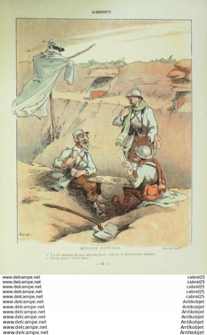Periodique authentique de 16 pages richement illustrees en couleurs de caricatures humoristiques et satiriques fut cree l'origine "x la baionnette" le 23 janvier 1915 par le dessinateur Henri Maigrot, dit Henriot , collaborateur de L'Illustration et pere d'emile Henriot et il fournit l'essentiel des dessins, durant 24 numeros, jusqu'au 3 juillet. format 310x220. Il tire son nom de la baionnette et de l'expression charger la baionnette, la charge etait d'ailleurs son activite favorite puisque celui-ci, distribue aux poilus, se moquait de la betise des Allemands, ridiculisant par des caricatures le Kaiser Guillaume II ou le Kronprinz Guillaume de Prusse. Le magazine changea d'editeur le 8 juillet 1915, pour une nouvelle serie, des le 13 aout, s'appela La Baionnette. La maquette, la ferocite de certains dessins, ainsi que le choix des dessinateurs, rappellent L'Assiette au beurre