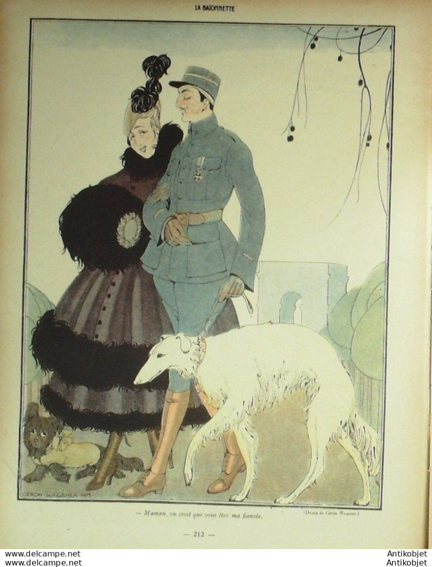 Periodique authentique de 16 pages richement illustrees en couleurs de caricatures humoristiques et satiriques fut cree l'origine "x la baionnette" le 23 janvier 1915 par le dessinateur Henri Maigrot, dit Henriot , collaborateur de L'Illustration et pere d'xmile Henriot et il fournit l'essentiel des dessins, durant 24 numeros, jusqu'au 3 juillet. format 310x220. Il tire son nom de la baionnette et de l'expression charger la baionnette, la charge etait d'ailleurs son activite favorite puisque celui-ci, distribue aux poilus, se moquait de la betise des Allemands, ridiculisant par des caricatures le Kaiser Guillaume II ou le Kronprinz Guillaume de Prusse. Le magazine changea d'editeur le 8 juillet 1915, pour une nouvelle serie, des le 13 aout, s'appela La Baionnette. La maquette, la ferocite de certains dessins, ainsi que le choix des dessinateurs, rappellent L'Assiette au beurre