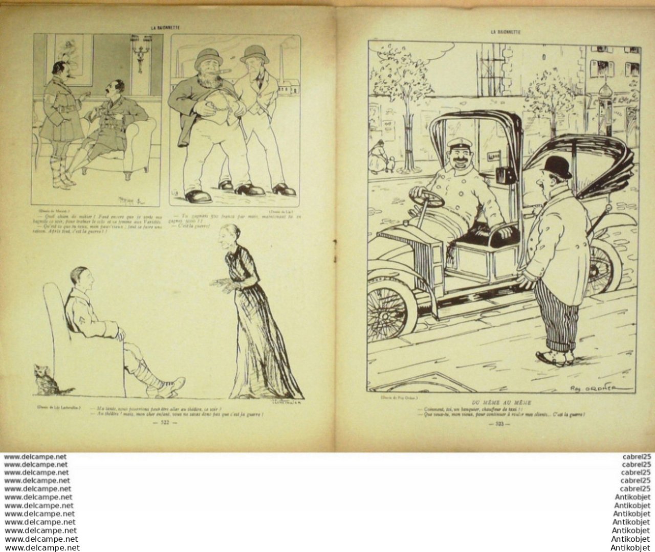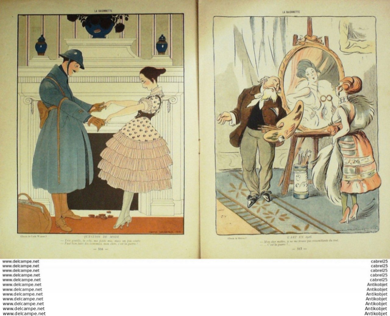 Periodique authentique de 16 pages richement illustrees en couleurs de caricatures humoristiques et satiriques fut cree l'origine "x la baionnette" le 23 janvier 1915 par le dessinateur Henri Maigrot, dit Henriot , collaborateur de L'Illustration et pere d'emile Henriot et il fournit l'essentiel des dessins, durant 24 numeros, jusqu'au 3 juillet. format 310x220. Il tire son nom de la baionnette et de l'expression charger la baionnette, la charge etait d'ailleurs son activite favorite puisque celui-ci, distribue aux poilus, se moquait de la betise des Allemands, ridiculisant par des caricatures le Kaiser Guillaume II ou le Kronprinz Guillaume de Prusse. Le magazine changea d'editeur le 8 juillet 1915, pour une nouvelle serie, des le 13 aout, s'appela La Baionnette. La maquette, la ferocite de certains dessins, ainsi que le choix des dessinateurs, rappellent L'Assiette au beurre