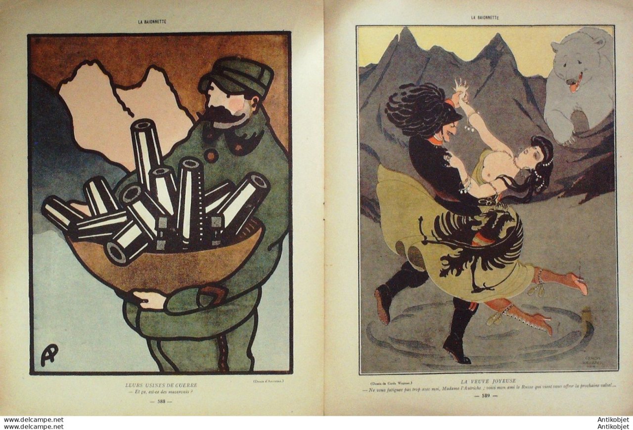 Periodique authentique de 16 pages richement illustrees en couleurs de caricatures humoristiques et satiriques fut cree l'origine "x la baionnette" le 23 janvier 1915 par le dessinateur Henri Maigrot, dit Henriot , collaborateur de L'Illustration et pere d'xmile Henriot et il fournit l'essentiel des dessins, durant 24 numeros, jusqu'au 3 juillet. format 310x220. Il tire son nom de la baionnette et de l'expression charger la baionnette, la charge etait d'ailleurs son activite favorite puisque celui-ci, distribue aux poilus, se moquait de la betise des Allemands, ridiculisant par des caricatures le Kaiser Guillaume II ou le Kronprinz Guillaume de Prusse. Le magazine changea d'editeur le 8 juillet 1915, pour une nouvelle serie, des le 13 aout, s'appela La Baionnette. La maquette, la ferocite de certains dessins, ainsi que le choix des dessinateurs, rappellent L'Assiette au beurre