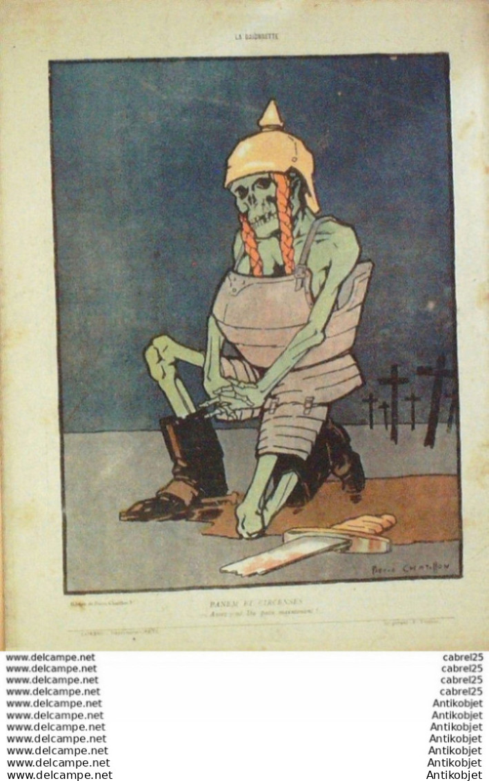 Periodique authentique de 16 pages richement illustrees en couleurs de caricatures humoristiques et satiriques fut cree l'origine "x la baionnette" le 23 janvier 1915 par le dessinateur Henri Maigrot, dit Henriot , collaborateur de L'Illustration et pere d'emile Henriot et il fournit l'essentiel des dessins, durant 24 numeros, jusqu'au 3 juillet. format 310x220. Il tire son nom de la baionnette et de l'expression charger la baionnette, la charge etait d'ailleurs son activite favorite puisque celui-ci, distribue aux poilus, se moquait de la betise des Allemands, ridiculisant par des caricatures le Kaiser Guillaume II ou le Kronprinz Guillaume de Prusse. Le magazine changea d'editeur le 8 juillet 1915, pour une nouvelle serie, des le 13 aout, s'appela La Baionnette. La maquette, la ferocite de certains dessins, ainsi que le choix des dessinateurs, rappellent L'Assiette au beurre
