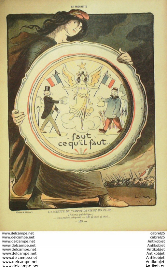 Ce periodique de 16 pages illustrees en couleurs de caricatures humoristiques et satiriques fut cree l'origine "x la baionnette" le 23 janvier 1915 par le dessinateur Henri Maigrot, dit Henriot , collaborateur de L'Illustration et pere d'emile Henriot et il fournit l'essentiel des dessins, durant 24 numeros, jusqu'au 3 juillet. Le prix est de 15 centimes au format 31 22 cm. Il tire son nom de la baionnette et de l'expression charger la baionnette, la charge etait d'ailleurs son activite favorite puisque celui-ci, distribue aux poilus, se moquait de la betise des Allemands, ridiculisant par des caricatures le Kaiser Guillaume II ou le Kronprinz Guillaume de Prusse. Le magazine changea d'editeur le 8 juillet 1915, pour une nouvelle serie, des le 13 aout, s'appela La Baionnette. La maquette, la ferocite de certains dessins, ainsi que le choix des dessinateurs, rappellent L'Assiette au beurre