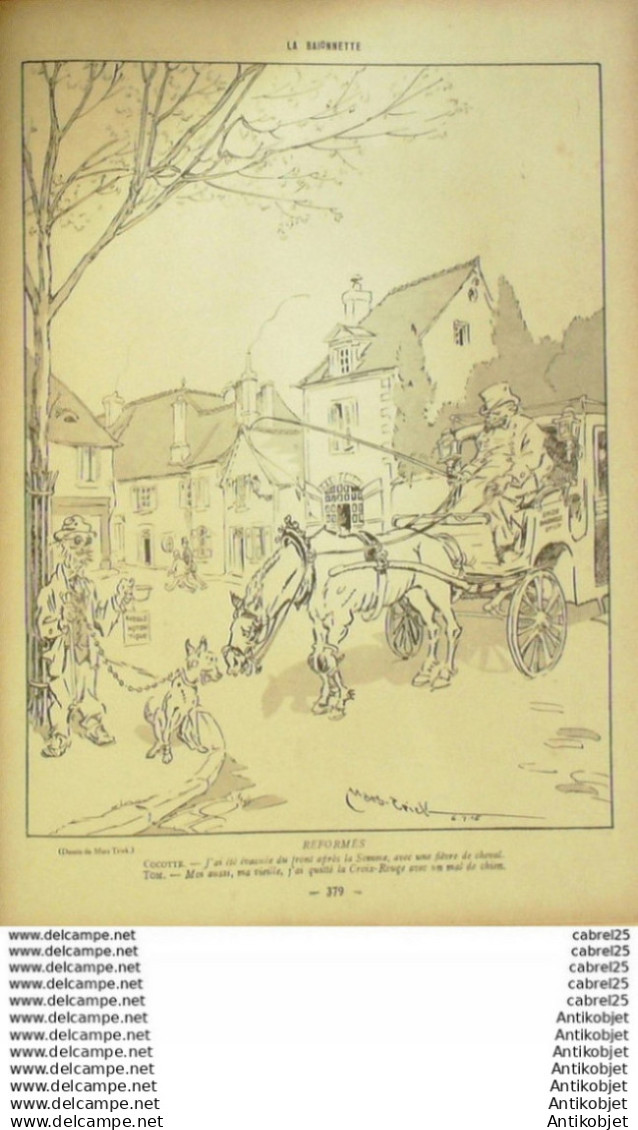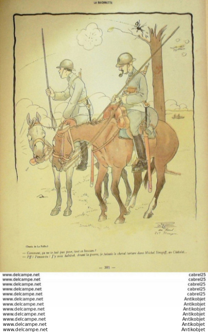 Periodique authentique de 16 pages richement illustrees en couleurs de caricatures humoristiques et satiriques fut cree l'origine "x la baionnette" le 23 janvier 1915 par le dessinateur Henri Maigrot, dit Henriot , collaborateur de L'Illustration et pere d'emile Henriot et il fournit l'essentiel des dessins, durant 24 numeros, jusqu'au 3 juillet. format 310x220. Il tire son nom de la baionnette et de l'expression charger la baionnette, la charge etait d'ailleurs son activite favorite puisque celui-ci, distribue aux poilus, se moquait de la betise des Allemands, ridiculisant par des caricatures le Kaiser Guillaume II ou le Kronprinz Guillaume de Prusse. Le magazine changea d'editeur le 8 juillet 1915, pour une nouvelle serie, des le 13 aout, s'appela La Baionnette. La maquette, la ferocite de certains dessins, ainsi que le choix des dessinateurs, rappellent L'Assiette au beurre