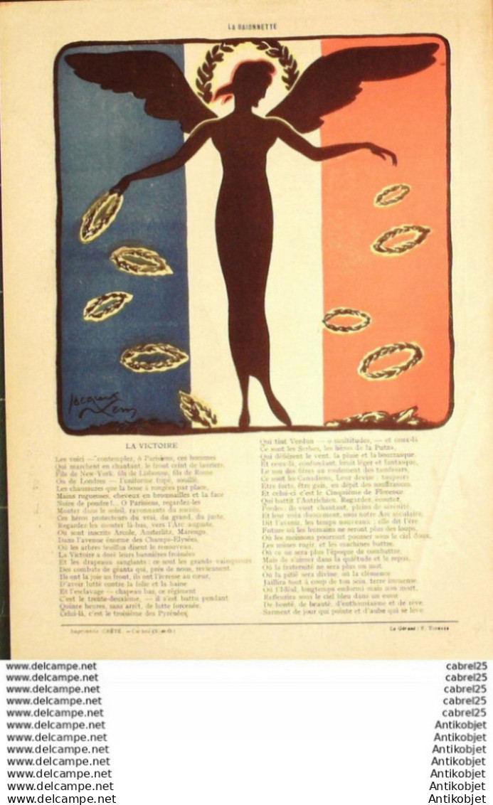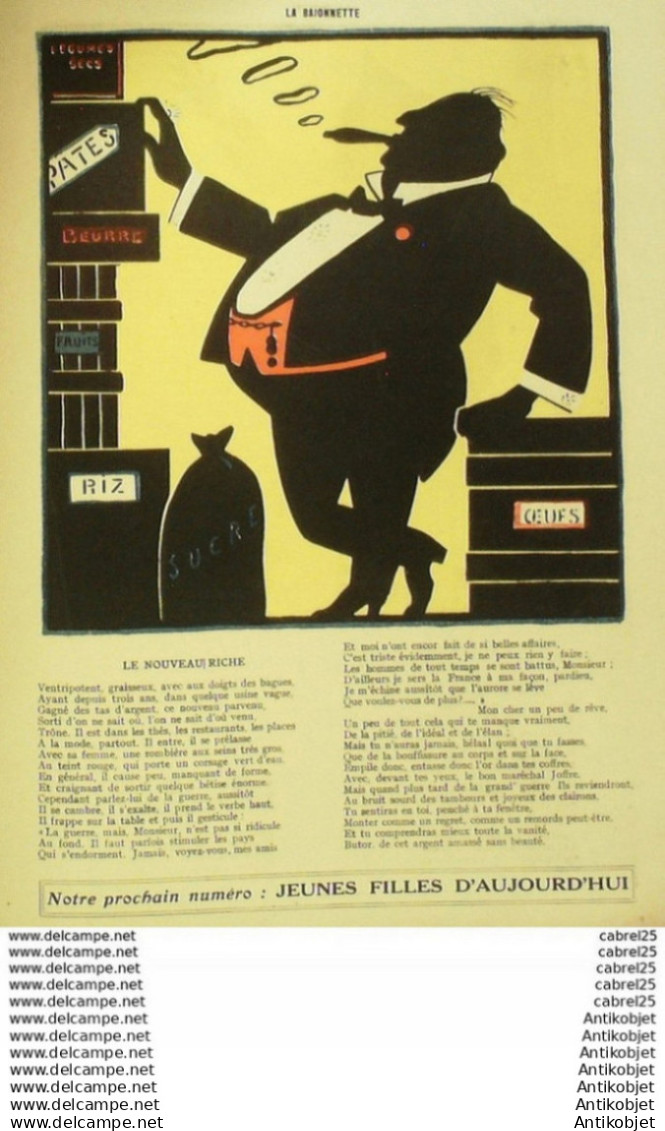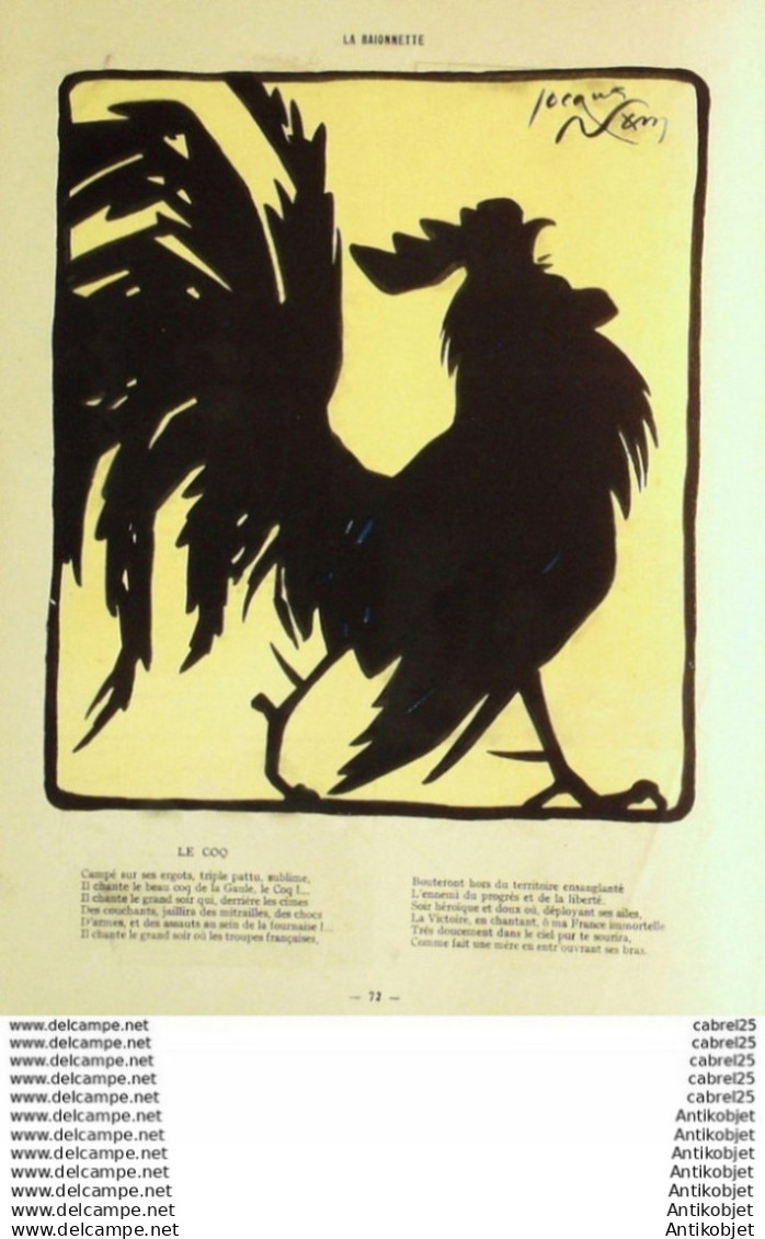 Periodique authentique de 16 pages richement illustrees en couleurs de caricatures humoristiques et satiriques fut cree l'origine "x la baionnette" le 23 janvier 1915 par le dessinateur Henri Maigrot, dit Henriot , collaborateur de L'Illustration et pere d'emile Henriot et il fournit l'essentiel des dessins, durant 24 numeros, jusqu'au 3 juillet. format 310x220. Il tire son nom de la baionnette et de l'expression charger la baionnette, la charge etait d'ailleurs son activite favorite puisque celui-ci, distribue aux poilus, se moquait de la betise des Allemands, ridiculisant par des caricatures le Kaiser Guillaume II ou le Kronprinz Guillaume de Prusse. Le magazine changea d'editeur le 8 juillet 1915, pour une nouvelle serie, des le 13 aout, s'appela La Baionnette. La maquette, la ferocite de certains dessins, ainsi que le choix des dessinateurs, rappellent L'Assiette au beurre