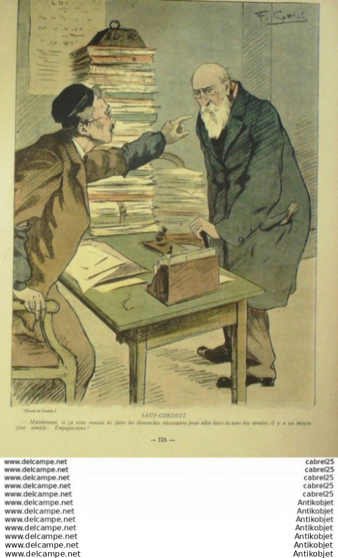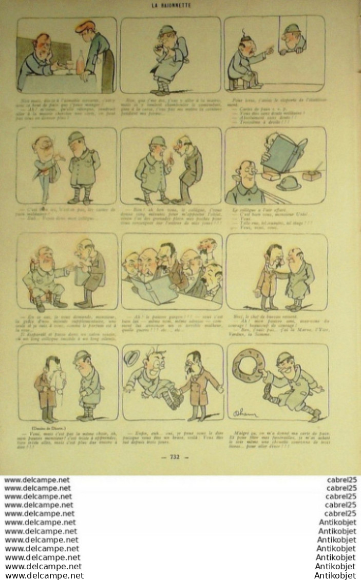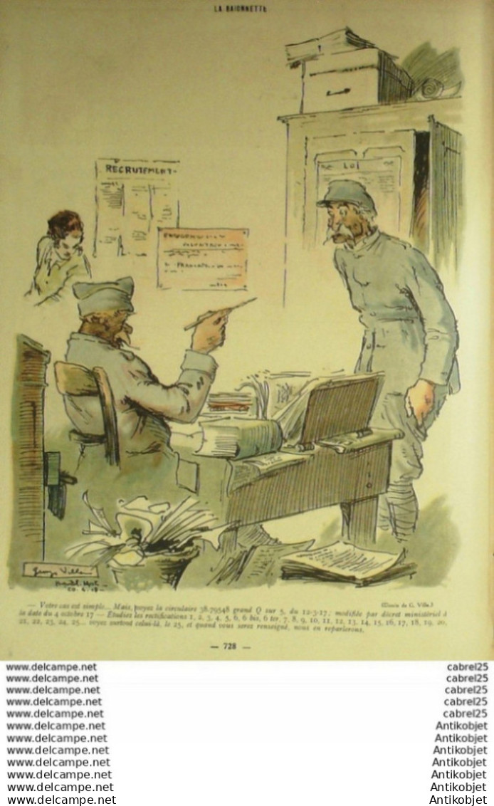 Periodique authentique de 16 pages richement illustrees en couleurs de caricatures humoristiques et satiriques fut cree l'origine "x la baionnette" le 23 janvier 1915 par le dessinateur Henri Maigrot, dit Henriot , collaborateur de L'Illustration et pere d'emile Henriot et il fournit l'essentiel des dessins, durant 24 numeros, jusqu'au 3 juillet. format 310x220. Il tire son nom de la baionnette et de l'expression charger la baionnette, la charge etait d'ailleurs son activite favorite puisque celui-ci, distribue aux poilus, se moquait de la betise des Allemands, ridiculisant par des caricatures le Kaiser Guillaume II ou le Kronprinz Guillaume de Prusse. Le magazine changea d'editeur le 8 juillet 1915, pour une nouvelle serie, des le 13 aout, s'appela La Baionnette. La maquette, la ferocite de certains dessins, ainsi que le choix des dessinateurs, rappellent L'Assiette au beurre
