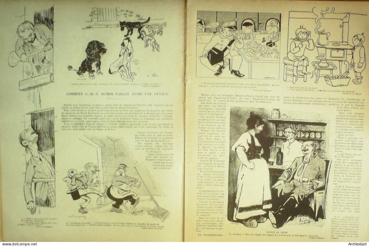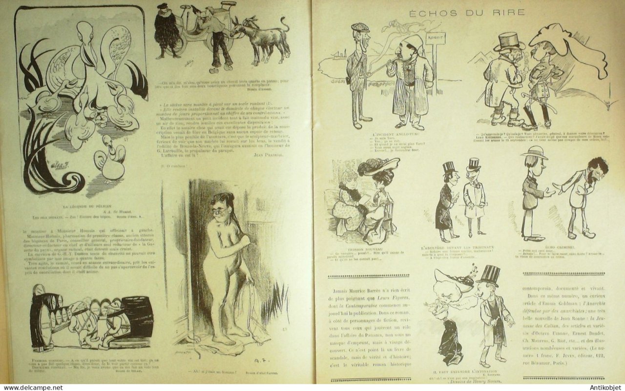 Reliure souple de 16 pages illustrées par de nombreux caricaturistes tels que Avelot Bac Balluriau Barcet Burret Capy Cappiello Carlegle Delannoy Delaw Faivre Florès Genty Gerbault Gottlob Guillaume Guydo Hemard Hermann Hérouard Huard Iribe Jeanniot Leandre Losques Markous Metivet Meunier Mirande Nob Ostoya Plumet Poulbot Prejelan Radiguet Roubille Sam Tiret Bugnet Villemot