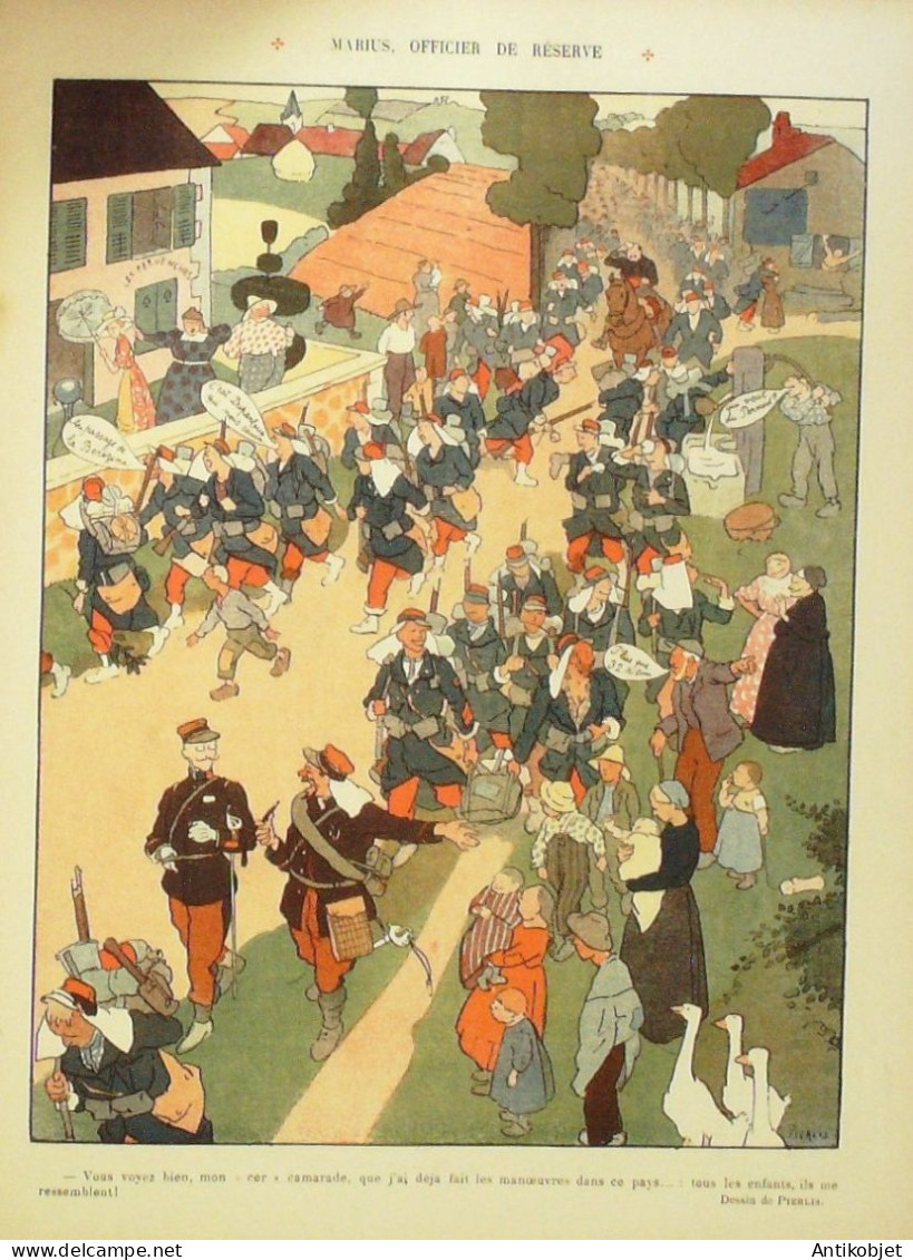 Reliure souple de 16 pages illustrées par de nombreux caricaturistes tels que Avelot Bac Balluriau Barcet Burret Capy Cappiello Carlegle Delannoy Delaw Faivre Florès Genty Gerbault Gottlob Guillaume Guydo Hemard Hermann Hérouard Huard Iribe Jeanniot Leandre Losques Markous Metivet Meunier Mirande Nob Ostoya Plumet Poulbot Prejelan Radiguet Roubille Sam Tiret Bugnet Villemot