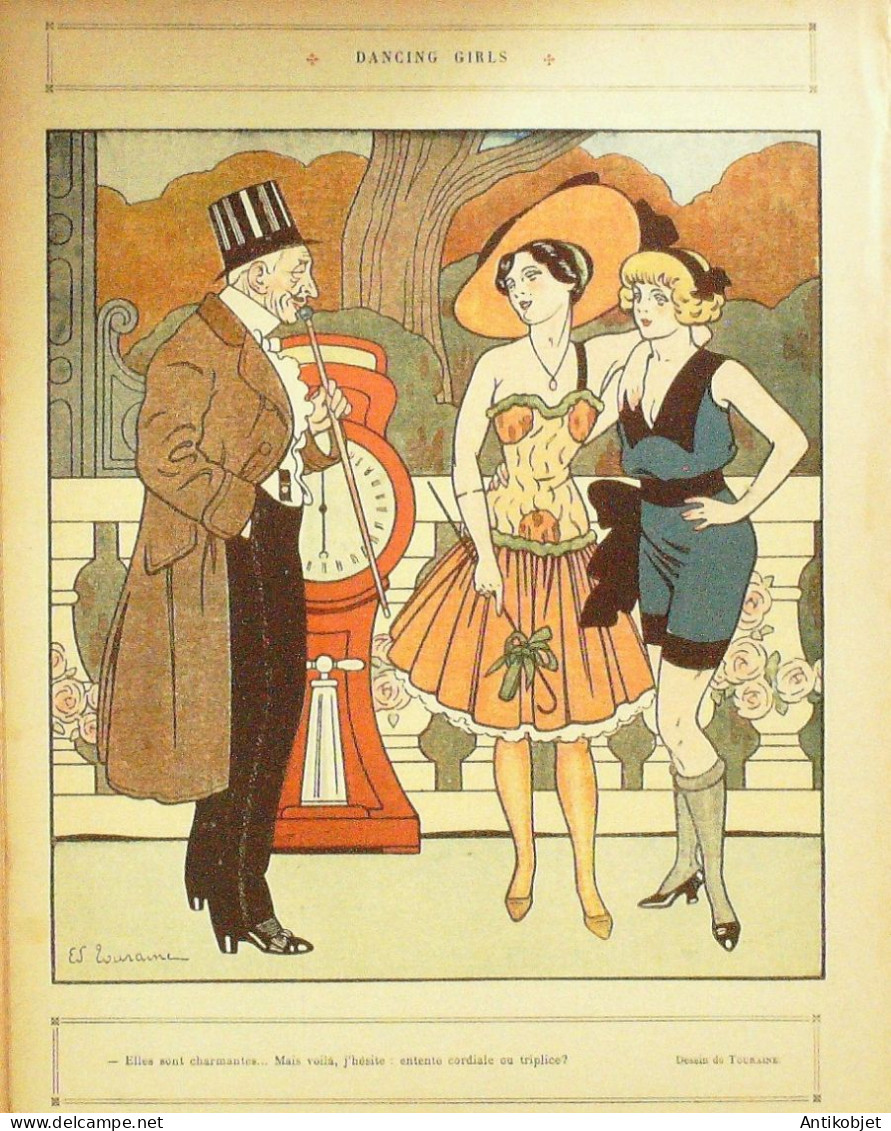 Reliure souple de 16 pages illustrées par de nombreux caricaturistes tels que Avelot Bac Balluriau Barcet Burret Capy Cappiello Carlegle Delannoy Delaw Faivre Florès Genty Gerbault Gottlob Guillaume Guydo Hemard Hermann Hérouard Huard Iribe Jeanniot Leandre Losques Markous Metivet Meunier Mirande Nob Ostoya Plumet Poulbot Prejelan Radiguet Roubille Sam Tiret Bugnet Villemot