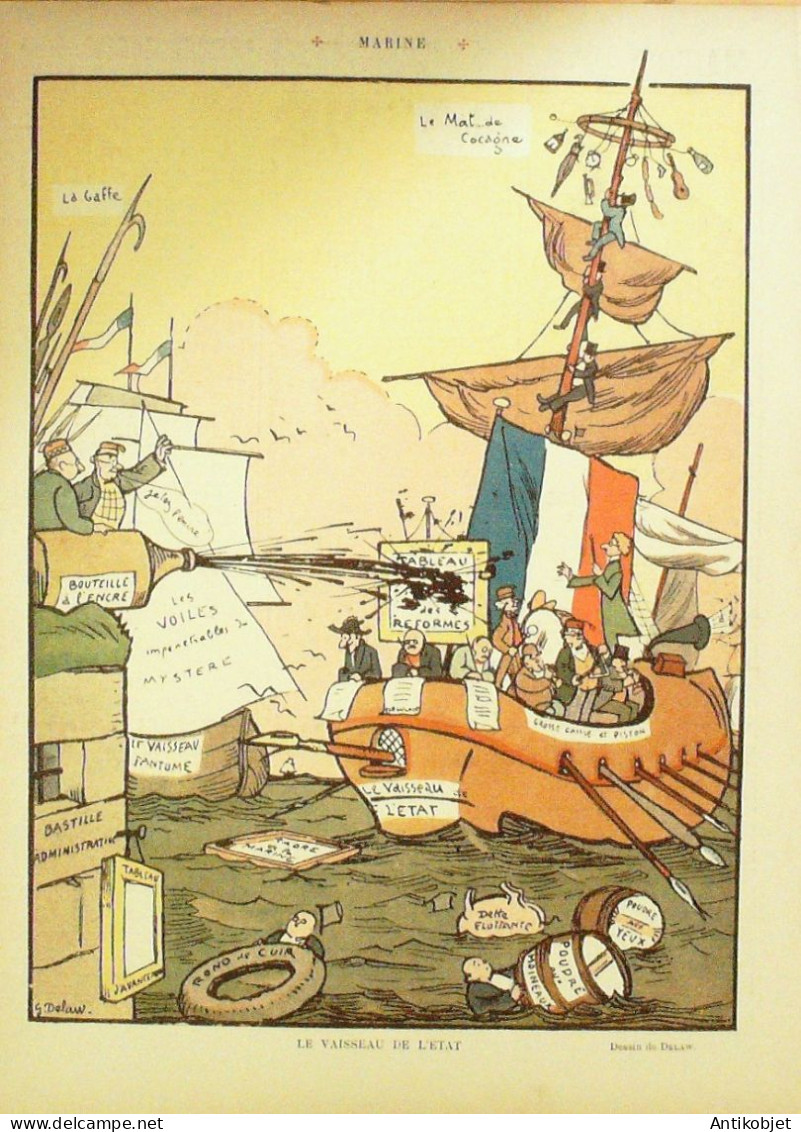 Reliure souple de 16 pages illustrées par de nombreux caricaturistes tels que Avelot Bac Balluriau Barcet Burret Capy Cappiello Carlegle Delannoy Delaw Faivre Florès Genty Gerbault Gottlob Guillaume Guydo Hemard Hermann Hérouard Huard Iribe Jeanniot Leandre Losques Markous Metivet Meunier Mirande Nob Ostoya Plumet Poulbot Prejelan Radiguet Roubille Sam Tiret Bugnet Villemot