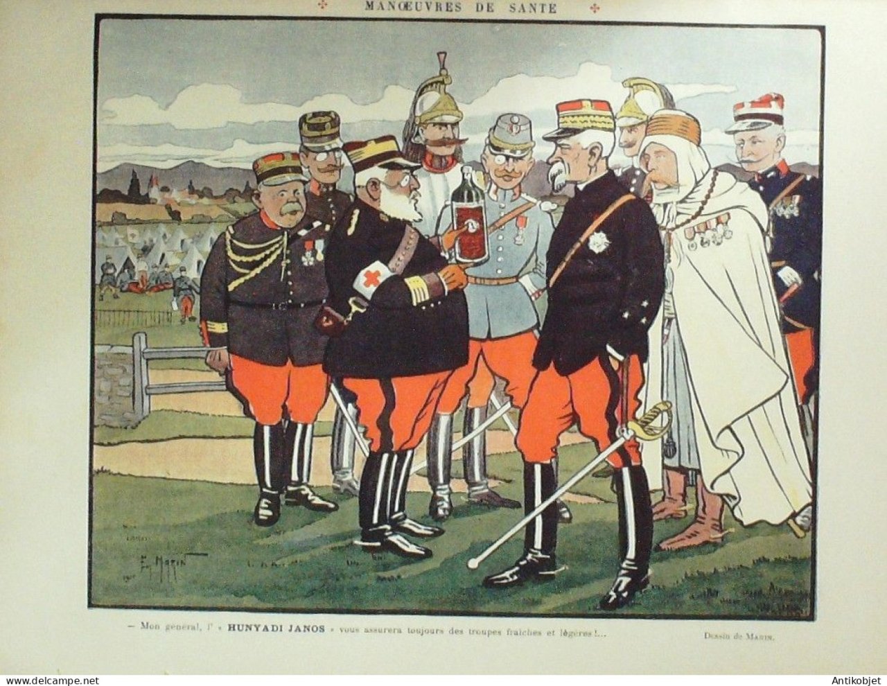 Reliure souple de 16 pages illustrées par de nombreux caricaturistes tels que Avelot Bac Balluriau Barcet Burret Capy Cappiello Carlegle Delannoy Delaw Faivre Florès Genty Gerbault Gottlob Guillaume Guydo Hemard Hermann Hérouard Huard Iribe Jeanniot Leandre Losques Markous Metivet Meunier Mirande Nob Ostoya Plumet Poulbot Prejelan Radiguet Roubille Sam Tiret Bugnet Villemot