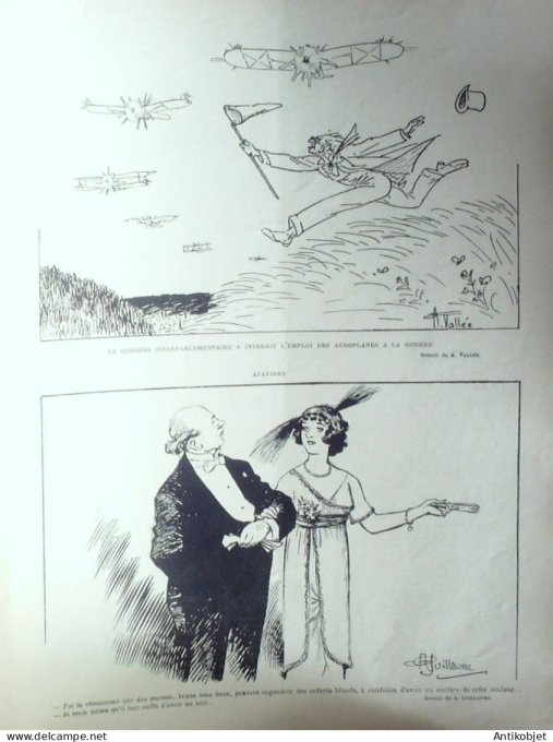 Reliure souple de 16 pages illustrées par de nombreux caricaturistes tels que Avelot Bac Balluriau Barcet Burret Capy Cappiello Carlegle Delannoy Delaw Faivre Florès Genty Gerbault Gottlob Guillaume Guydo Hemard Hermann Hérouard Huard Iribe Jeanniot Leandre Losques Markous Metivet Meunier Mirande Nob Ostoya Plumet Poulbot Prejelan Radiguet Roubille Sam Tiret Bugnet Villemot
