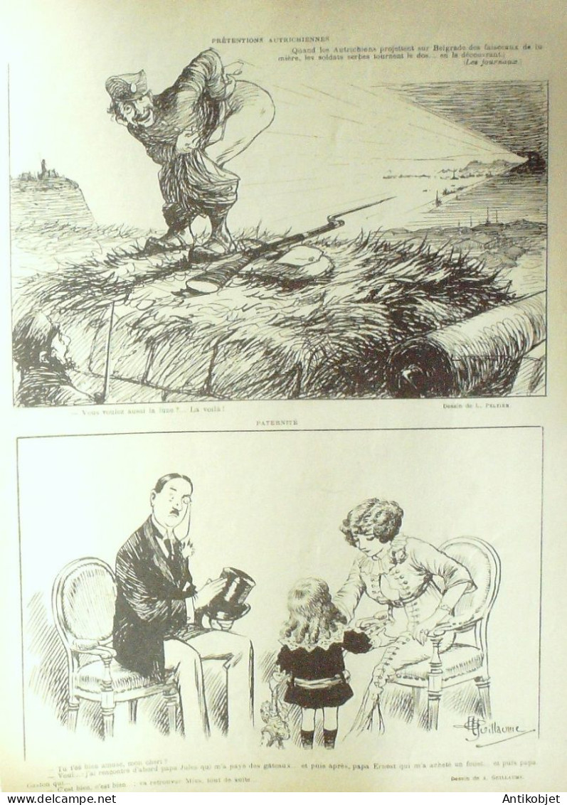 Reliure souple de 16 pages illustrées par de nombreux caricaturistes tels que Avelot Bac Balluriau Barcet Burret Capy Cappiello Carlegle Delannoy Delaw Faivre Florès Genty Gerbault Gottlob Guillaume Guydo Hemard Hermann Hérouard Huard Iribe Jeanniot Leandre Losques Markous Metivet Meunier Mirande Nob Ostoya Plumet Poulbot Prejelan Radiguet Roubille Sam Tiret Bugnet Villemot