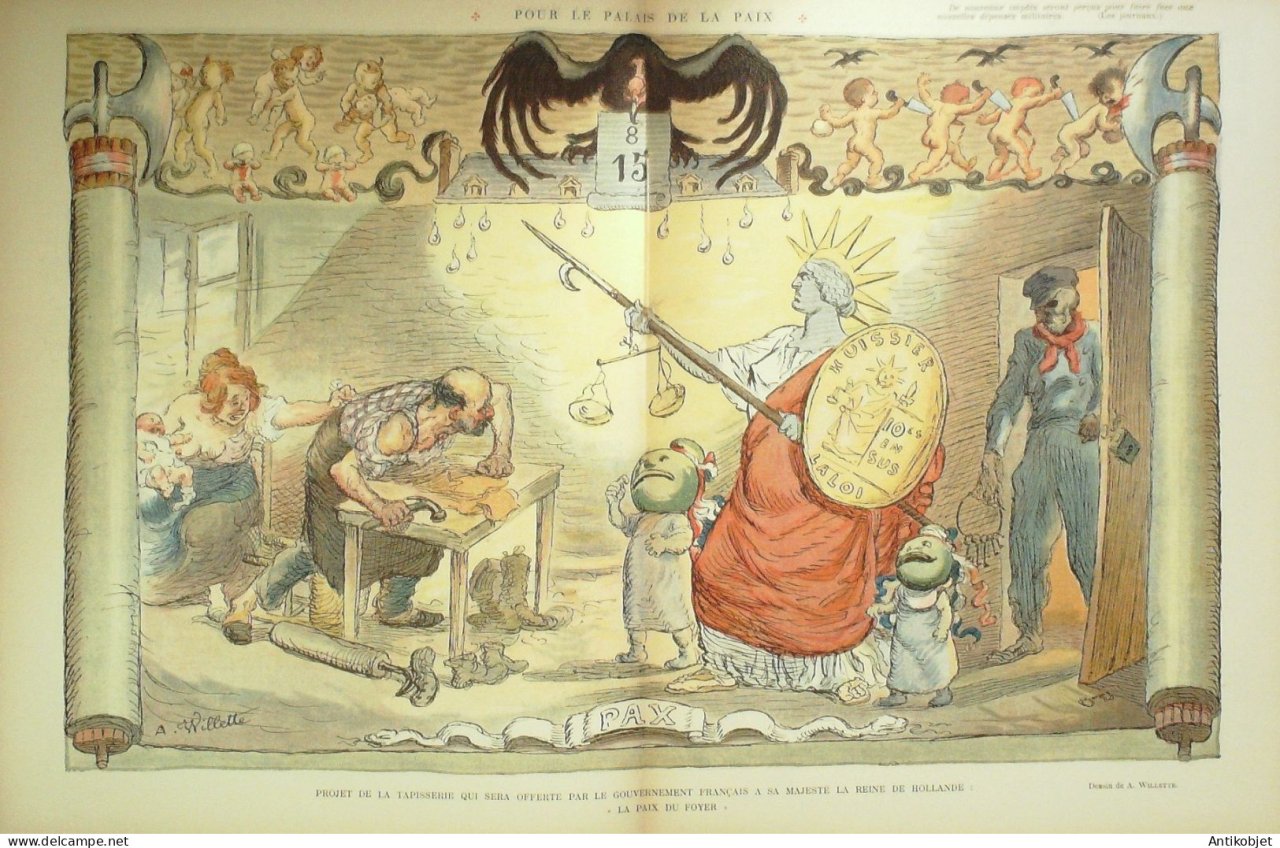 Reliure souple de 16 pages illustrées par de nombreux caricaturistes tels que Avelot Bac Balluriau Barcet Burret Capy Cappiello Carlegle Delannoy Delaw Faivre Florès Genty Gerbault Gottlob Guillaume Guydo Hemard Hermann Hérouard Huard Iribe Jeanniot Leandre Losques Markous Metivet Meunier Mirande Nob Ostoya Plumet Poulbot Prejelan Radiguet Roubille Sam Tiret Bugnet Villemot