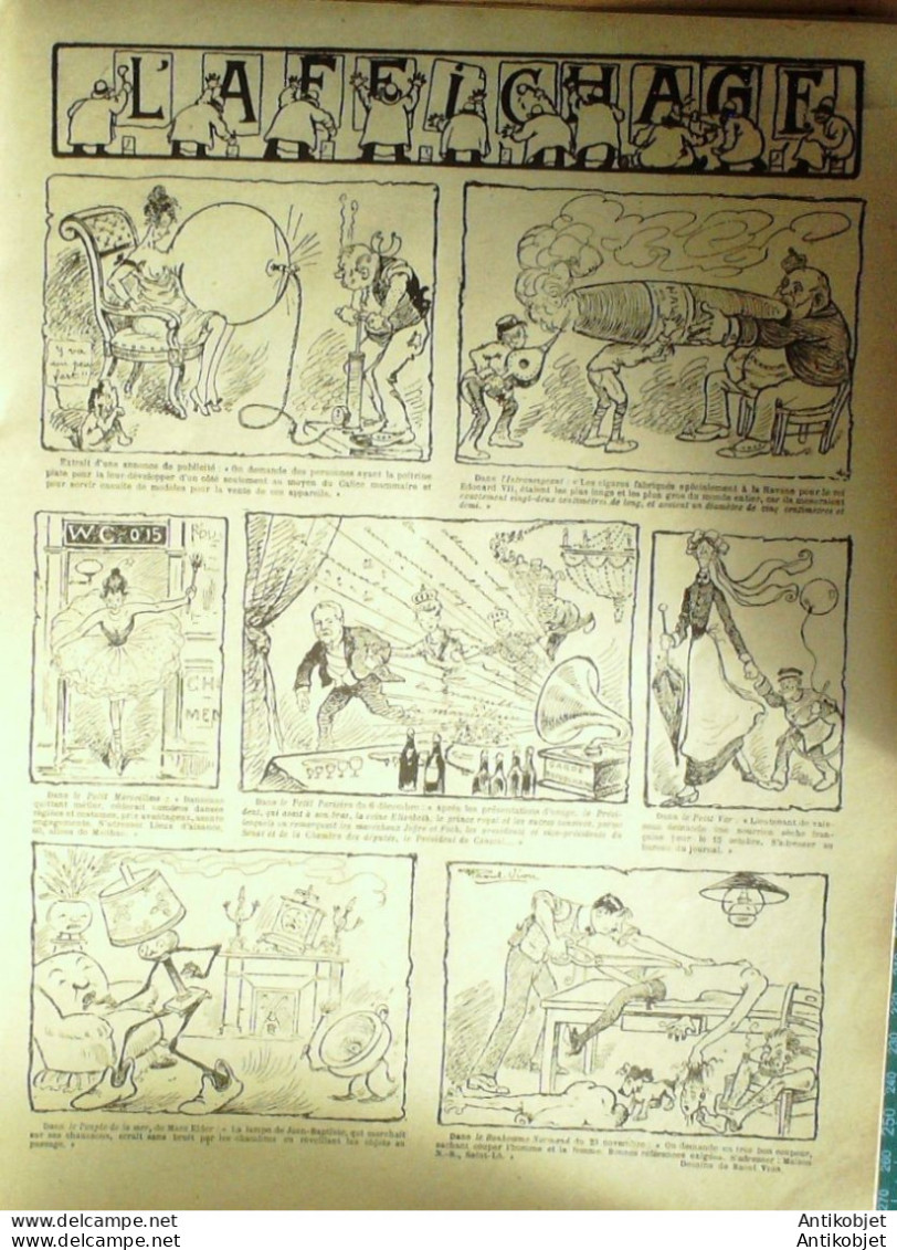 Reliure souple de 16 pages illustrées par de nombreux caricaturistes tels que Avelot Bac Balluriau Barcet Burret Capy Cappiello Carlegle Delannoy Delaw Faivre Florès Genty Gerbault Gottlob Guillaume Guydo Hemard Hermann Hérouard Huard Iribe Jeanniot Leandre Losques Markous Metivet Meunier Mirande Nob Ostoya Plumet Poulbot Prejelan Radiguet Roubille Sam Tiret Bugnet Villemot
