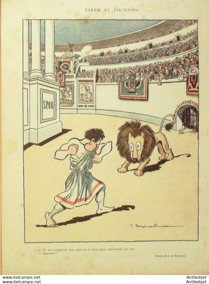 Reliure souple de 16 pages illustrées par de nombreux caricaturistes tels que Avelot Bac Balluriau Barcet Burret Capy Cappiello Carlegle Delannoy Delaw Faivre Florès Genty Gerbault Gottlob Guillaume Guydo Hemard Hermann Hérouard Huard Iribe Jeanniot Leandre Losques Markous Metivet Meunier Mirande Nob Ostoya Plumet Poulbot Prejelan Radiguet Roubille Sam Tiret Bugnet Villemot