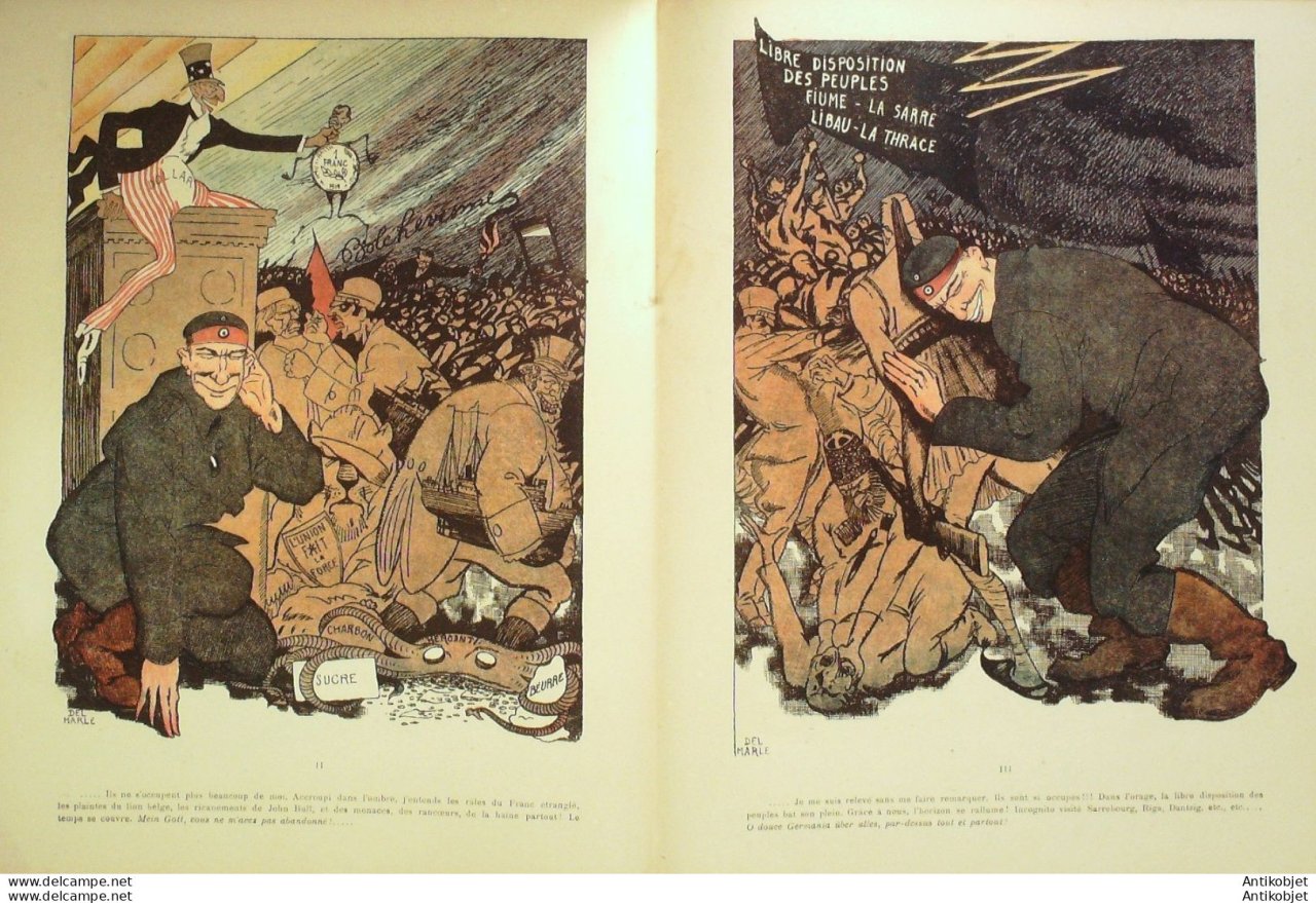 Reliure souple de 16 pages illustrées par de nombreux caricaturistes tels que Avelot Bac Balluriau Barcet Burret Capy Cappiello Carlegle Delannoy Delaw Faivre Florès Genty Gerbault Gottlob Guillaume Guydo Hemard Hermann Hérouard Huard Iribe Jeanniot Leandre Losques Markous Metivet Meunier Mirande Nob Ostoya Plumet Poulbot Prejelan Radiguet Roubille Sam Tiret Bugnet Villemot