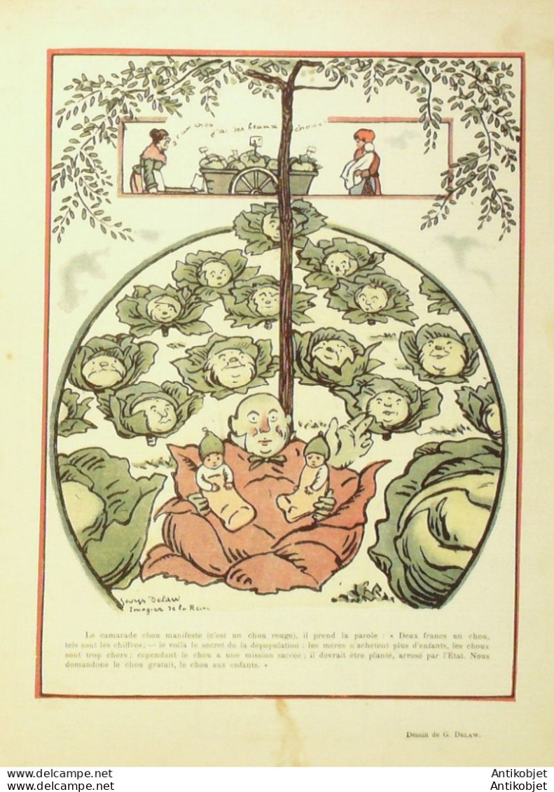 Reliure souple de 16 pages illustrées par de nombreux caricaturistes tels que Avelot Bac Balluriau Barcet Burret Capy Cappiello Carlegle Delannoy Delaw Faivre Florès Genty Gerbault Gottlob Guillaume Guydo Hemard Hermann Hérouard Huard Iribe Jeanniot Leandre Losques Markous Metivet Meunier Mirande Nob Ostoya Plumet Poulbot Prejelan Radiguet Roubille Sam Tiret Bugnet Villemot