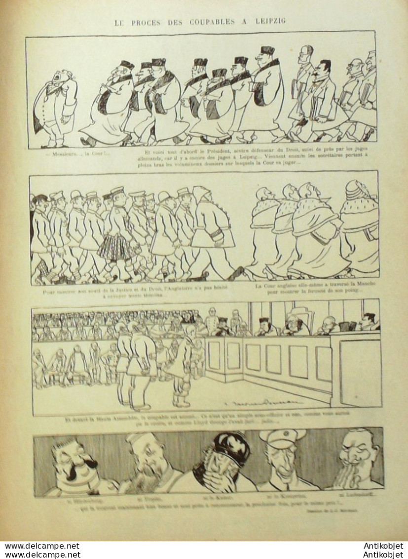 Reliure souple de 16 pages illustrées par de nombreux caricaturistes tels que Avelot Bac Balluriau Barcet Burret Capy Cappiello Carlegle Delannoy Delaw Faivre Florès Genty Gerbault Gottlob Guillaume Guydo Hemard Hermann Hérouard Huard Iribe Jeanniot Leandre Losques Markous Metivet Meunier Mirande Nob Ostoya Plumet Poulbot Prejelan Radiguet Roubille Sam Tiret Bugnet Villemot