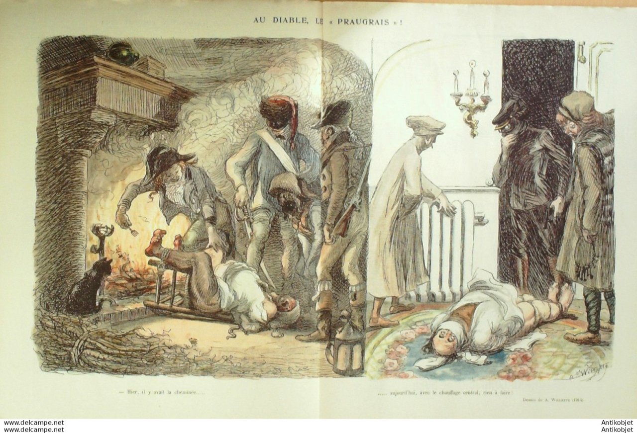 Reliure souple de 16 pages illustrées par de nombreux caricaturistes tels que Avelot Bac Balluriau Barcet Burret Capy Cappiello Carlegle Delannoy Delaw Faivre Florès Genty Gerbault Gottlob Guillaume Guydo Hemard Hermann Hérouard Huard Iribe Jeanniot Leandre Losques Markous Metivet Meunier Mirande Nob Ostoya Plumet Poulbot Prejelan Radiguet Roubille Sam Tiret Bugnet Villemot