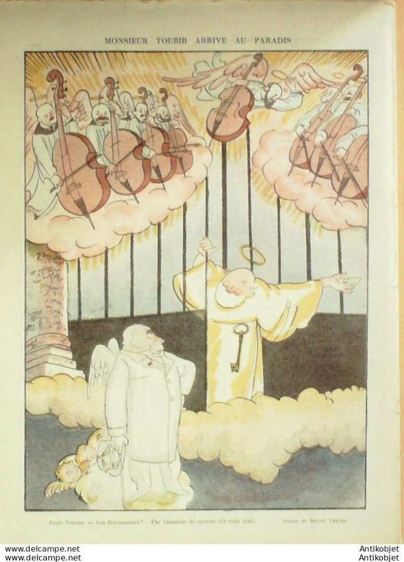 Reliure souple de 16 pages illustrées par de nombreux caricaturistes tels que Avelot Bac Balluriau Barcet Burret Capy Cappiello Carlegle Delannoy Delaw Faivre Florès Genty Gerbault Gottlob Guillaume Guydo Hemard Hermann Hérouard Huard Iribe Jeanniot Leandre Losques Markous Metivet Meunier Mirande Nob Ostoya Plumet Poulbot Prejelan Radiguet Roubille Sam Tiret Bugnet Villemot