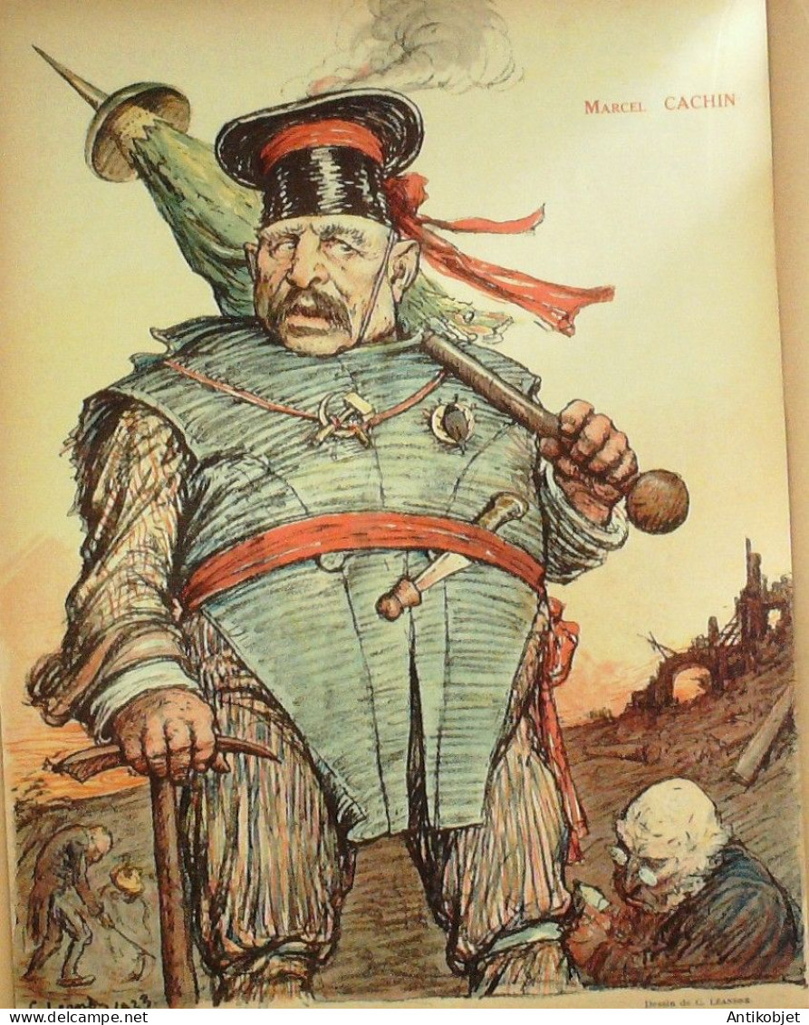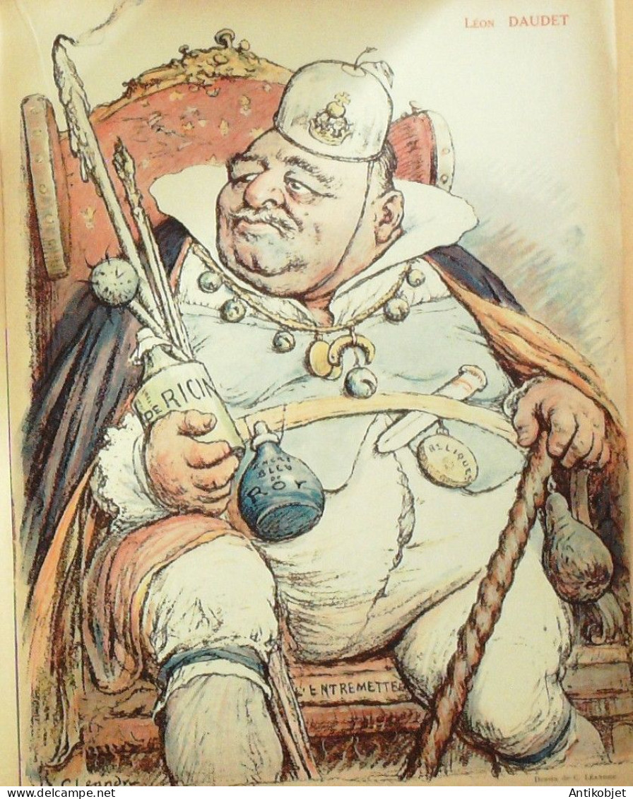 Reliure souple de 16 pages illustrées par de nombreux caricaturistes tels que Avelot Bac Balluriau Barcet Burret Capy Cappiello Carlegle Delannoy Delaw Faivre Florès Genty Gerbault Gottlob Guillaume Guydo Hemard Hermann Hérouard Huard Iribe Jeanniot Leandre Losques Markous Metivet Meunier Mirande Nob Ostoya Plumet Poulbot Prejelan Radiguet Roubille Sam Tiret Bugnet Villemot