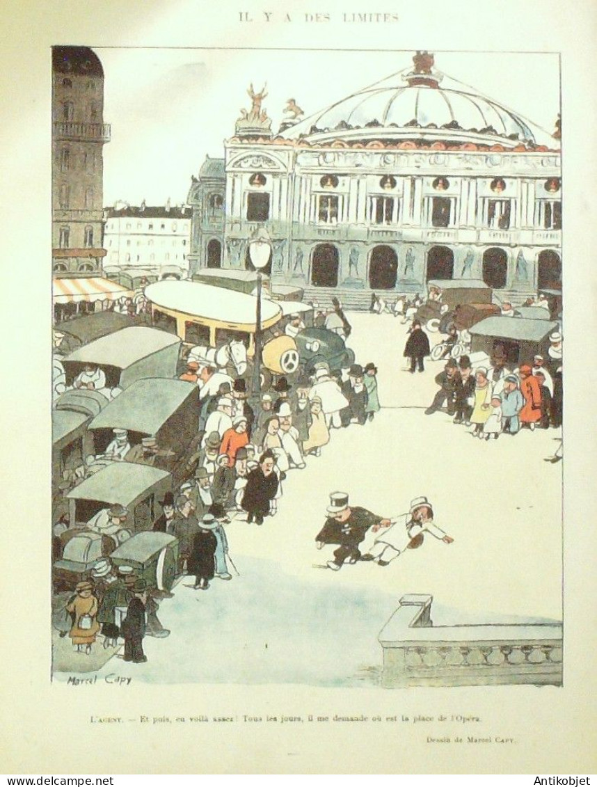 Reliure souple de 16 pages illustrées par de nombreux caricaturistes tels que Avelot Bac Balluriau Barcet Burret Capy Cappiello Carlegle Delannoy Delaw Faivre Florès Genty Gerbault Gottlob Guillaume Guydo Hemard Hermann Hérouard Huard Iribe Jeanniot Leandre Losques Markous Metivet Meunier Mirande Nob Ostoya Plumet Poulbot Prejelan Radiguet Roubille Sam Tiret Bugnet Villemot