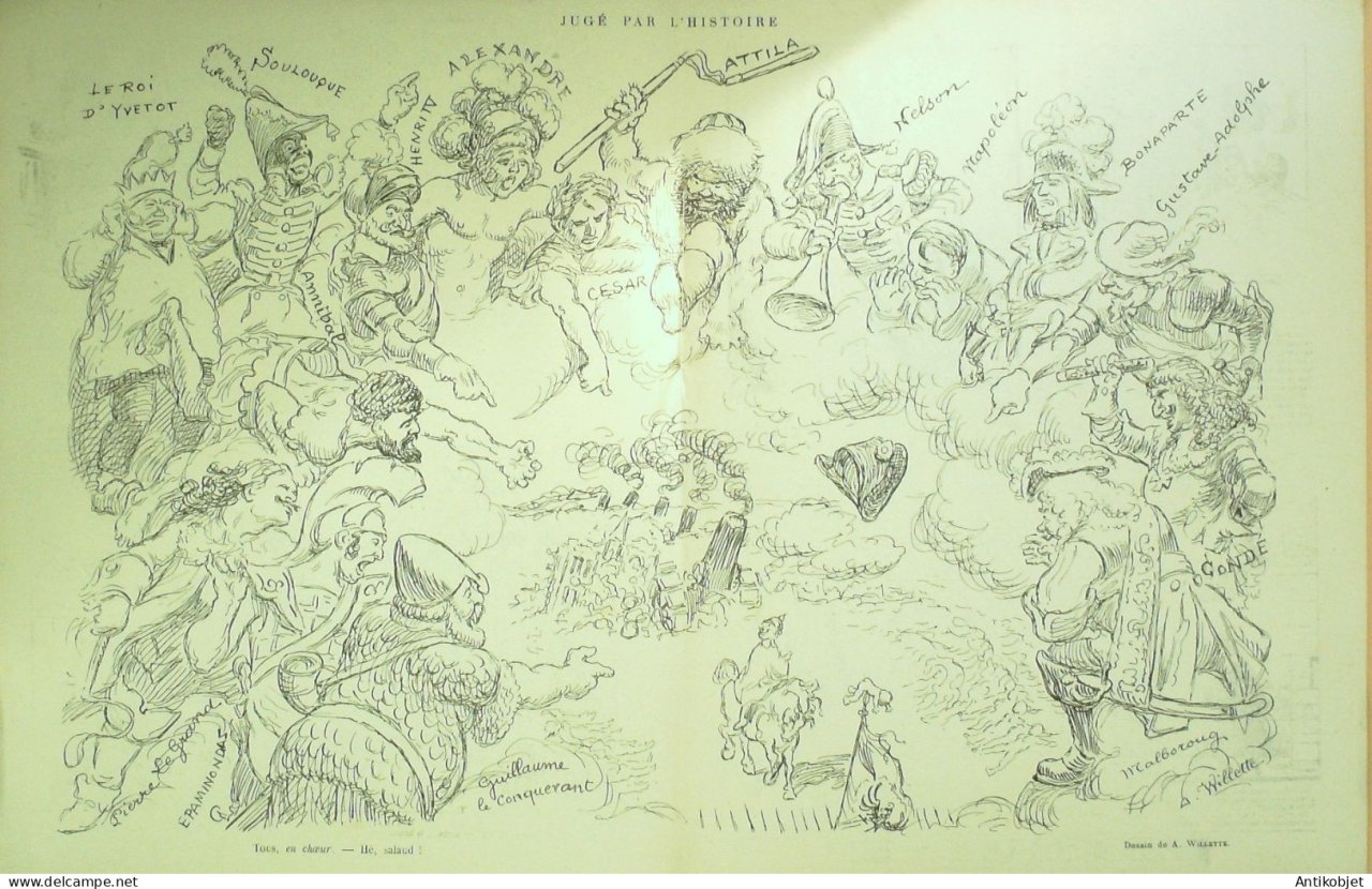 Reliure souple de 16 pages illustrées par de nombreux caricaturistes tels que Avelot Bac Balluriau Barcet Burret Capy Cappiello Carlegle Delannoy Delaw Faivre Florès Genty Gerbault Gottlob Guillaume Guydo Hemard Hermann Hérouard Huard Iribe Jeanniot Leandre Losques Markous Metivet Meunier Mirande Nob Ostoya Plumet Poulbot Prejelan Radiguet Roubille Sam Tiret Bugnet Villemot