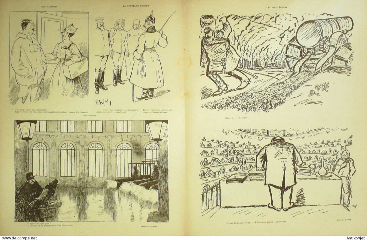 Reliure souple de 16 pages illustrées par de nombreux caricaturistes tels que Avelot Bac Balluriau Barcet Burret Capy Cappiello Carlegle Delannoy Delaw Faivre Florès Genty Gerbault Gottlob Guillaume Guydo Hemard Hermann Hérouard Huard Iribe Jeanniot Leandre Losques Markous Metivet Meunier Mirande Nob Ostoya Plumet Poulbot Prejelan Radiguet Roubille Sam Tiret Bugnet Villemot