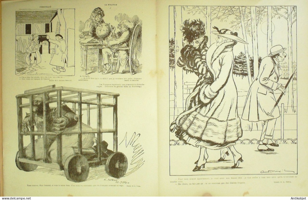 Reliure souple de 16 pages illustrées par de nombreux caricaturistes tels que Avelot Bac Balluriau Barcet Burret Capy Cappiello Carlegle Delannoy Delaw Faivre Florès Genty Gerbault Gottlob Guillaume Guydo Hemard Hermann Hérouard Huard Iribe Jeanniot Leandre Losques Markous Metivet Meunier Mirande Nob Ostoya Plumet Poulbot Prejelan Radiguet Roubille Sam Tiret Bugnet Villemot