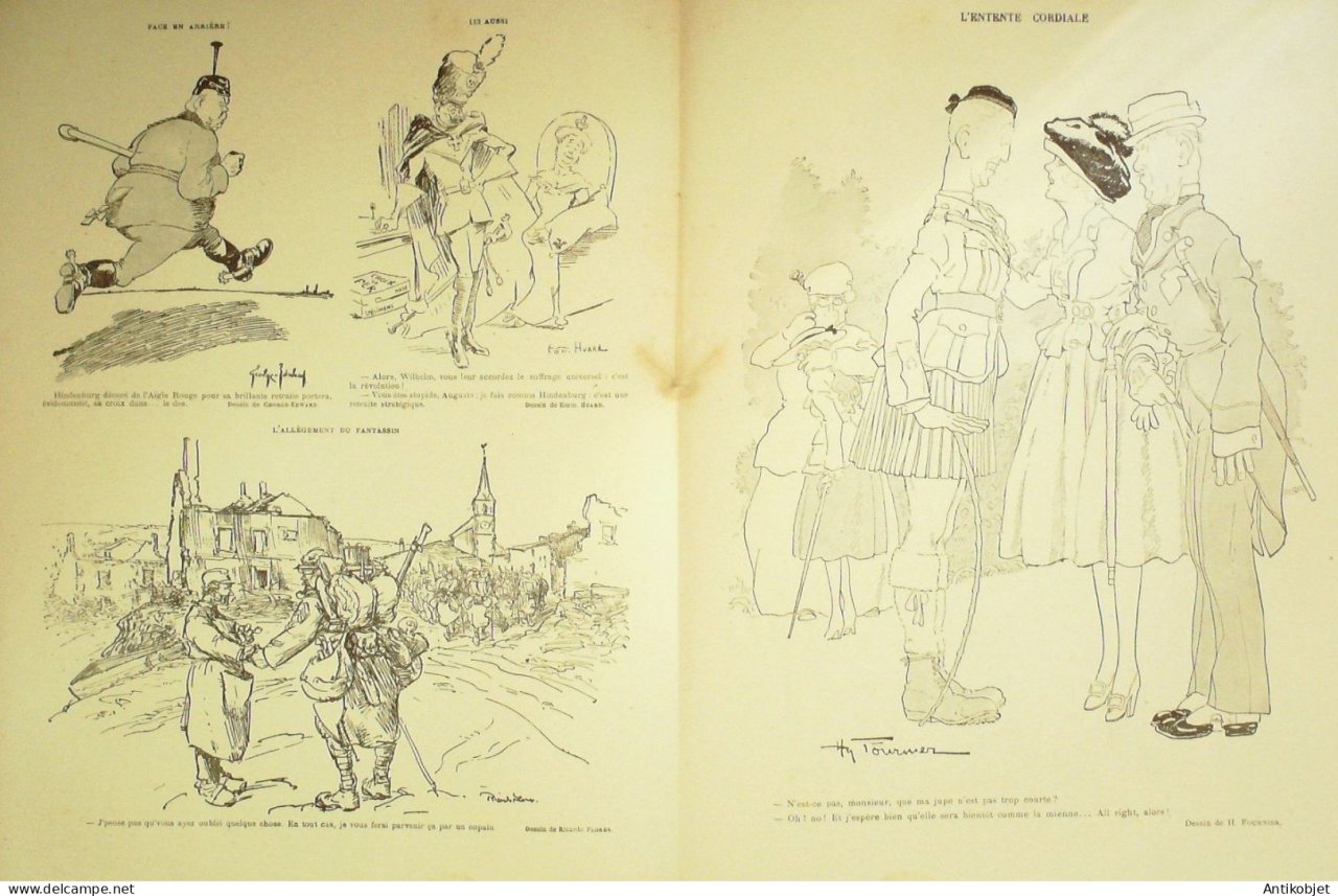Reliure souple de 16 pages illustrées par de nombreux caricaturistes tels que Avelot Bac Balluriau Barcet Burret Capy Cappiello Carlegle Delannoy Delaw Faivre Florès Genty Gerbault Gottlob Guillaume Guydo Hemard Hermann Hérouard Huard Iribe Jeanniot Leandre Losques Markous Metivet Meunier Mirande Nob Ostoya Plumet Poulbot Prejelan Radiguet Roubille Sam Tiret Bugnet Villemot