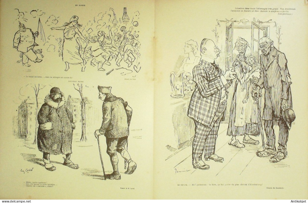Reliure souple de 16 pages illustrées par de nombreux caricaturistes tels que Avelot Bac Balluriau Barcet Burret Capy Cappiello Carlegle Delannoy Delaw Faivre Florès Genty Gerbault Gottlob Guillaume Guydo Hemard Hermann Hérouard Huard Iribe Jeanniot Leandre Losques Markous Metivet Meunier Mirande Nob Ostoya Plumet Poulbot Prejelan Radiguet Roubille Sam Tiret Bugnet Villemot