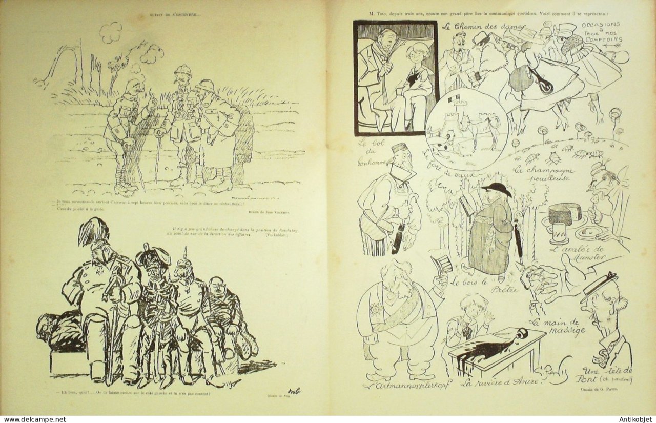 Reliure souple de 16 pages illustrées par de nombreux caricaturistes tels que Avelot Bac Balluriau Barcet Burret Capy Cappiello Carlegle Delannoy Delaw Faivre Florès Genty Gerbault Gottlob Guillaume Guydo Hemard Hermann Hérouard Huard Iribe Jeanniot Leandre Losques Markous Metivet Meunier Mirande Nob Ostoya Plumet Poulbot Prejelan Radiguet Roubille Sam Tiret Bugnet Villemot