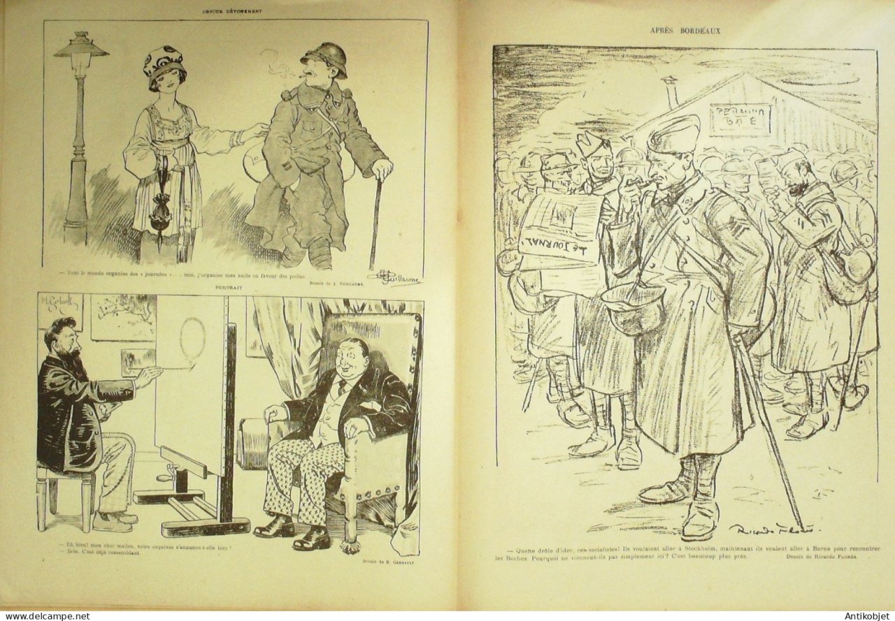 Reliure souple de 16 pages illustrées par de nombreux caricaturistes tels que Avelot Bac Balluriau Barcet Burret Capy Cappiello Carlegle Delannoy Delaw Faivre Florès Genty Gerbault Gottlob Guillaume Guydo Hemard Hermann Hérouard Huard Iribe Jeanniot Leandre Losques Markous Metivet Meunier Mirande Nob Ostoya Plumet Poulbot Prejelan Radiguet Roubille Sam Tiret Bugnet Villemot