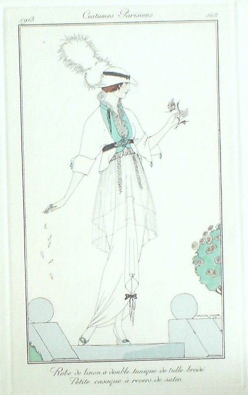Eau forte authentique coloriee au pochoir rehaussee a la main, sur papier velin verge de Hollande filigrane : edition du journal des dames et des modes costumes parisiens fonde en 1797 par Jean-Baptiste Selleque, et repris en 1801 par Pierre de La Mesangere : Ces toilettes et coiffes representees dressent un panel pointu du costume feminin sous le Directoire, le Consulat et l'Empire ainsi que des costumes masculins. format 120 x 220 . (tirage 1250 exemplaires numerotes) dessinateurs illustrant l'ensemble de ces oeuvres(Barbier George, Berty B, Bureau Louis, Pecoud Andre, Wegener Gerda, Baskt Leon, Brunelleschi Umberto, Damy Robert, Souef J.Renee, Rouard geo, Smith Ismael, Loeze, Gaudray d'Anjou, Metzanov Aris, Sesboue Suzanne, Lemaire Germaine, Taquoy Maurice, Simeon Fernand, Carus Arlette, Gose Javier, Drian Adrien Etienne, Lhuer Victor, Vallee Armand, Fournier Henri, Boutet de Monvel Bernard, Bussy, Broch Jan van, Vever, Legran Pierre, Franc-Nohain Madeleine (mfn)...Lorenzi Fabius, Pichenot Robert, Broders Roger, Honore H, Stefan Andre, Lemain Germaine ) Modele : Robe de linon a double tunique de tulle brode, casaque a revers de satin
