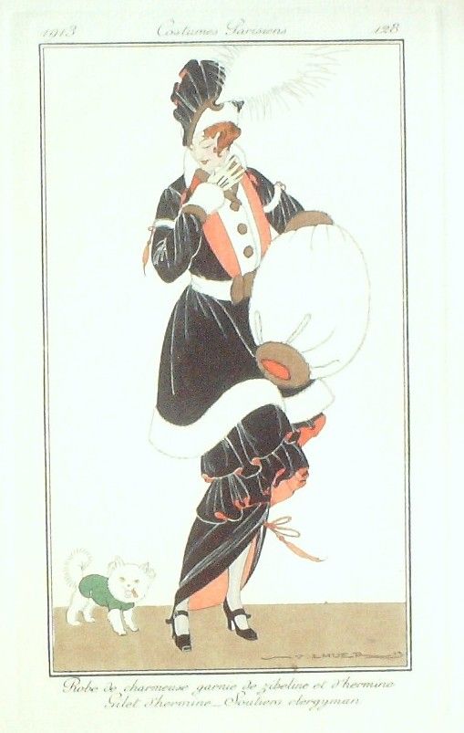 Eau forte authentique coloriee au pochoir rehaussee a la main, sur papier velin verge de Hollande filigrane : edition du journal des dames et des modes costumes parisiens fonde en 1797 par Jean-Baptiste Selleque, et repris en 1801 par Pierre de La Mesangere : Ces toilettes et coiffes representees dressent un panel pointu du costume feminin sous le Directoire, le Consulat et l'Empire ainsi que des costumes masculins. format 120 x 220 . (tirage 1250 exemplaires numerotes) dessinateurs illustrant l'ensemble de ces oeuvres(Barbier George, Berty B, Bureau Louis, Pecoud Andre, Wegener Gerda, Baskt Leon, Brunelleschi Umberto, Damy Robert, Souef J.Renee, Rouard geo, Smith Ismael, Loeze, Gaudray d'Anjou, Metzanov Aris, Sesboue Suzanne, Lemaire Germaine, Taquoy Maurice, Simeon Fernand, Carus Arlette, Gose Javier, Drian Adrien Etienne, Lhuer Victor, Vallee Armand, Fournier Henri, Boutet de Monvel Bernard, Bussy, Broch Jan van, Vever, Legran Pierre, Franc-Nohain Madeleine (mfn)...Lorenzi Fabius, Pichenot Robert, Broders Roger, Honore H, Stefan Andre, Lemain Germaine ) Modele : Robe de charmeuse garnie de zibeline et d'hermine, gilet d'hermine, soutiens clargyman