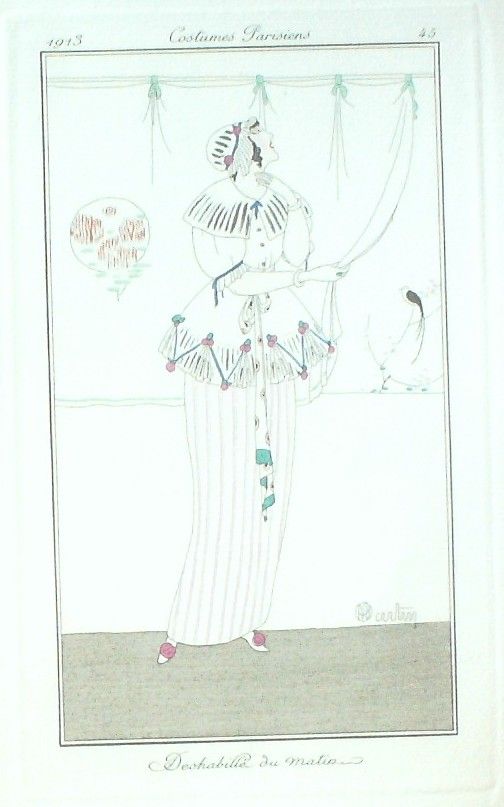 Eau forte authentique coloriee au pochoir rehaussee a la main, sur papier velin verge de Hollande filigrane : edition du journal des dames et des modes costumes parisiens fonde en 1797 par Jean-Baptiste Selleque, et repris en 1801 par Pierre de La Mesangere : Ces toilettes et coiffes representees dressent un panel pointu du costume feminin sous le Directoire, le Consulat et l'Empire ainsi que des costumes masculins. format 120 x 220 . (tirage 1250 exemplaires numerotes) dessinateurs illustrant l'ensemble de ces oeuvres(Barbier George, Berty B, Bureau Louis, Pecoud Andre, Wegener Gerda, Baskt Leon, Brunelleschi Umberto, Damy Robert, Souef J.Renee, Rouard geo, Smith Ismael, Loeze, Gaudray d'Anjou, Metzanov Aris, Sesboue Suzanne, Lemaire Germaine, Taquoy Maurice, Simeon Fernand, Carus Arlette, Gose Javier, Drian Adrien Etienne, Lhuer Victor, Vallee Armand, Fournier Henri, Boutet de Monvel Bernard, Bussy, Broch Jan van, Vever, Legran Pierre, Franc-Nohain Madeleine (mfn)...Lorenzi Fabius, Pichenot Robert, Broders Roger, Honore H, Stefan Andre, Lemain Germaine ) Modele : Deshabille du matin