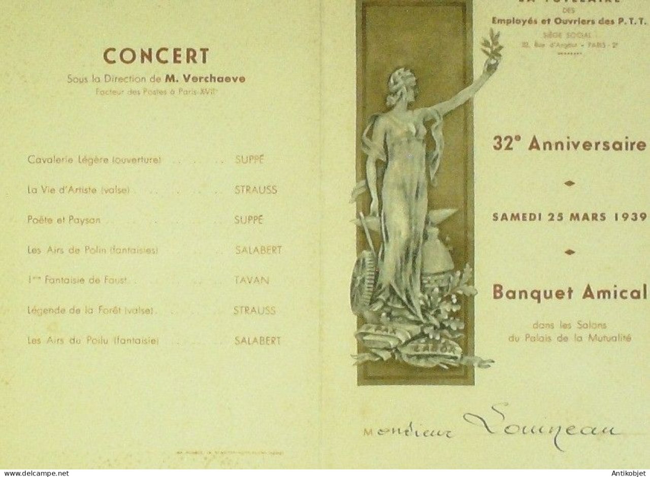 Menu banquet illustre La Tutelaire des P.T.T Salon de Mutualite Paris 1939