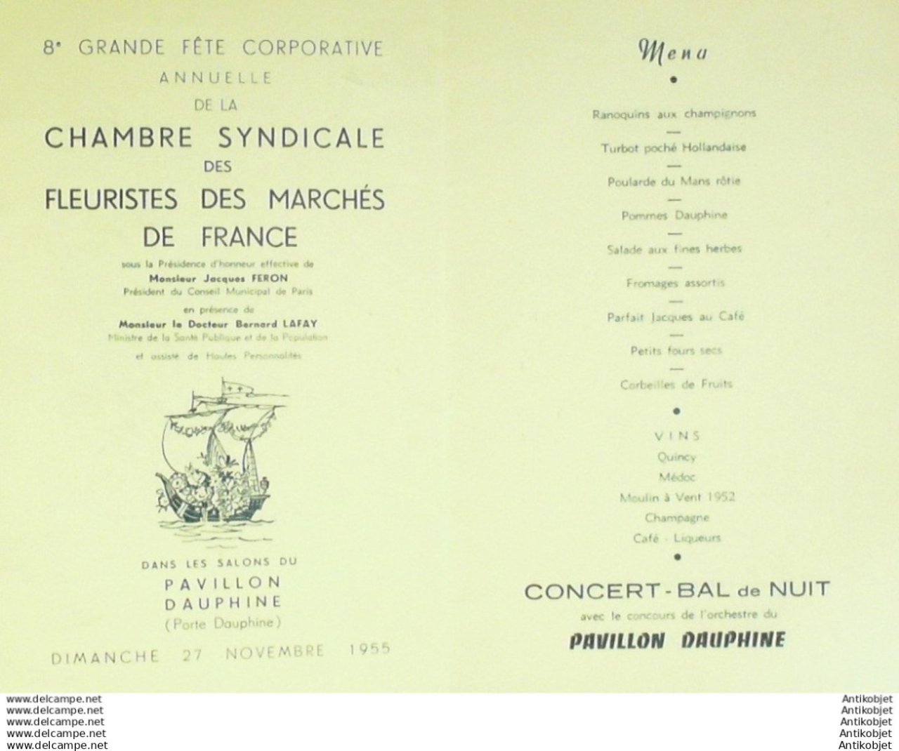 Menu banquet illustre Pavillon Dauphine (Chambre syndicale des fleuristes) 1955