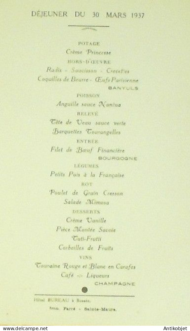 Menu illustre de noce Hôtel Bureau à Bossee (37) 1937