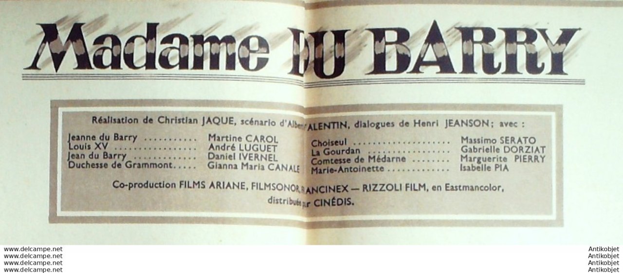 Hebdomadaire du cinema constitue de 16 pages, paru de 1924 Ã 1967 interrompu de 1938 Ã juin 1946. Nombreuses scenes et photos accompagnant les films presentes. Film 1 Clyde Beatty Mickey Spillane, Jack Stang, Kenneth Torey, Kathy Cline film 2 Madame du Barry Martine Carol, Andre Luguet, Daniel Ivernel, Massimo Serato, Isabelle Pia, Gabrielle Dorziat, portrait Dominique Wilms