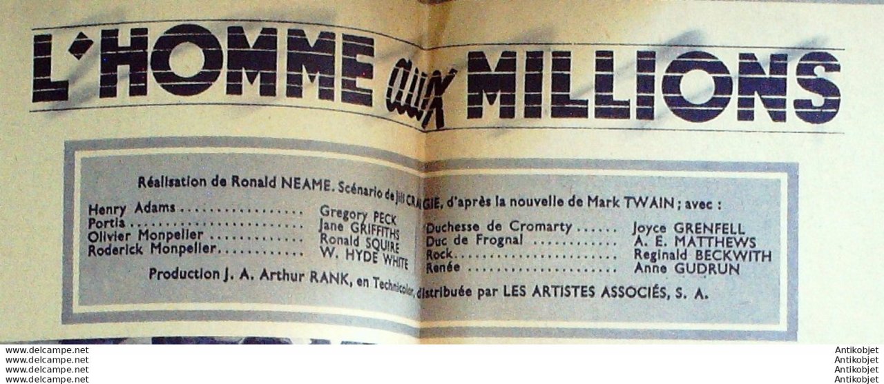 Hebdomadaire du cinema constitue de 16 pages, paru de 1924 à 1967 interrompu de 1938 à juin 1946. Nombreuses scenes et photos accompagnant les films presentes. Film 1 Daniel Gelin Françoise Arnoul Georges Chamarat- Film 2 : L'homme aux millions Gregory PeckJane Griffiths Ronald Squire Joye Grenfell Anne Gudrun