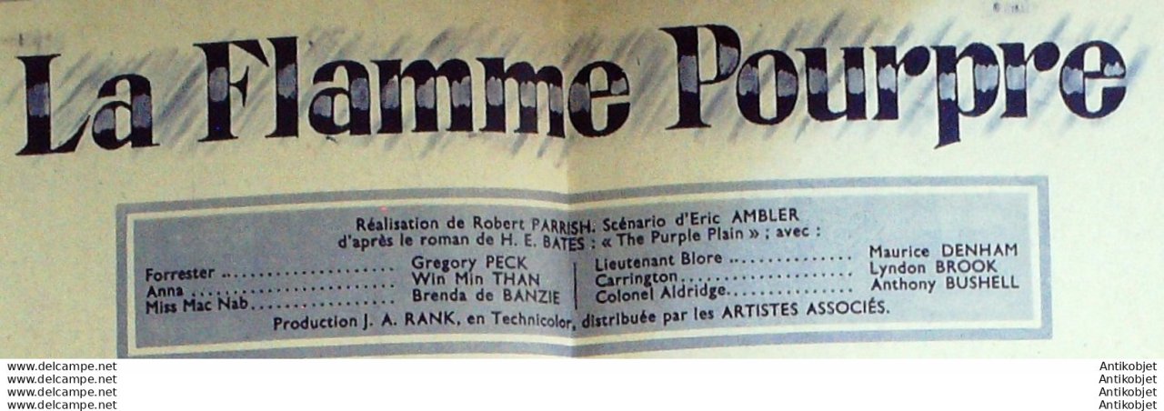 Hebdomadaire du cinema constitue de 16 pages, paru de 1924 Ã 1967 interrompu de 1938 Ã juin 1946. Nombreuses scenes et photos accompagnant les films presentes. Film 1 Milena Nervi, Renee Delmas, Suzanne Grey, Dany Carrel Dora Doll Raymond BussieresFilm 2 la flamme pourpre Gregory Peck, Maurice Denham, Anthony Bushell, Brenda de Banzie