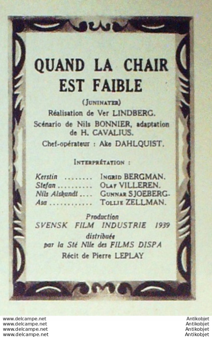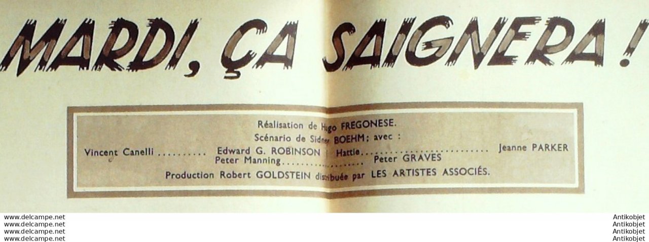 Hebdomadaire du cinema constitue de 16 pages, paru de 1924 à 1967 interrompu de 1938 à juin 1946. Nombreuses scenes et photos accompagnant les films presentes. Film 1 Ingrind Bergmann Tollie Zellman Olaf Villeren - Film 2 Mardi ça saignera Peter Manning, Peter Graves, Jeanne Parker, Edward G Robinson