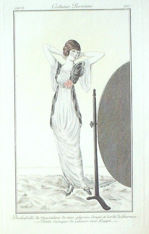 Eau forte authentique coloriee au pochoir rehaussee a la main, sur papier velin verge de Hollande filigrane : edition du journal des dames et des modes costumes parisiens fonde en 1797 par Jean-Baptiste Selleque, et repris en 1801 par Pierre de La Mesangere : Ces toilettes et coiffes representees dressent un panel pointu du costume feminin sous le Directoire, le Consulat et l'Empire ainsi que des costumes masculins. format 120 x 220 . (tirage 1250 exemplaires numerotes) dessinateurs illustrant l'ensemble de ces oeuvres(Barbier George, Berty B, Bureau Louis, Pecoud Andre, Wegener Gerda, Baskt Leon, Brunelleschi Umberto, Damy Robert, Souef J.Renee, Rouard geo, Smith Ismael, Loeze, Gaudray d'Anjou, Metzanov Aris, Sesboue Suzanne, Lemaire Germaine, Taquoy Maurice, Simeon Fernand, Carus Arlette, Gose Javier, Drian Adrien Etienne, Lhuer Victor, Vallee Armand, Fournier Henri, Boutet de Monvel Bernard, Bussy, Broch Jan van, Vever, Legran Pierre, Franc-Nohain Madeleine (mfn)...Lorenzi Fabius, Pichenot Robert, Broders Roger, Honore H, Stefan Andre, Lemain Germaine ) Modele : Deshabille de mousseline de soie glycine drape et borde de fourrure , petite casaque de velours noir frappe
