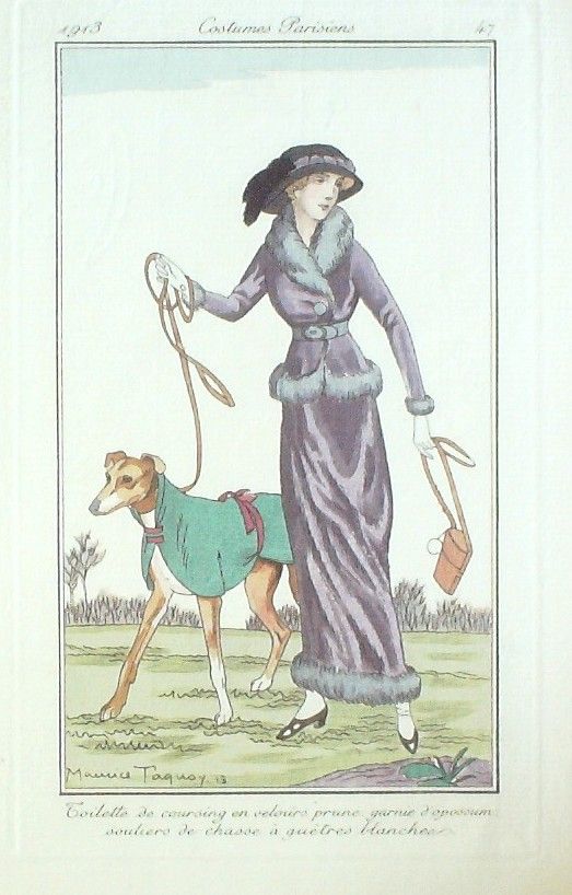 Eau forte authentique coloriee au pochoir rehaussee a la main, sur papier velin verge de Hollande filigrane : edition du journal des dames et des modes costumes parisiens fonde en 1797 par Jean-Baptiste Selleque, et repris en 1801 par Pierre de La Mesangere : Ces toilettes et coiffes representees dressent un panel pointu du costume feminin sous le Directoire, le Consulat et l'Empire ainsi que des costumes masculins. format 120 x 220 . (tirage 1250 exemplaires numerotes) dessinateurs illustrant l'ensemble de ces oeuvres(Barbier George, Berty B, Bureau Louis, Pecoud Andre, Wegener Gerda, Baskt Leon, Brunelleschi Umberto, Damy Robert, Souef J.Renee, Rouard geo, Smith Ismael, Loeze, Gaudray d'Anjou, Metzanov Aris, Sesboue Suzanne, Lemaire Germaine, Taquoy Maurice, Simeon Fernand, Carus Arlette, Gose Javier, Drian Adrien Etienne, Lhuer Victor, Vallee Armand, Fournier Henri, Boutet de Monvel Bernard, Bussy, Broch Jan van, Vever, Legran Pierre, Franc-Nohain Madeleine (mfn)...Lorenzi Fabius, Pichenot Robert, Broders Roger, Honore H, Stefan Andre, Lemain Germaine ) Modele : Toilette de coursing en velours prune, garnie d'opposum souliers de chasse a guetres blanches