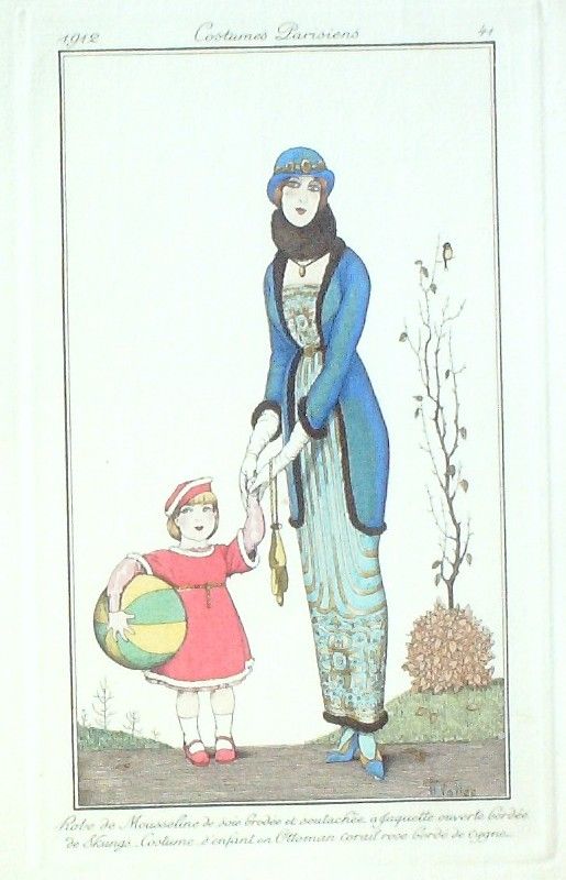 Eau forte authentique coloriee au pochoir rehaussee a la main, sur papier velin verge de Hollande filigrane : edition du journal des dames et des modes costumes parisiens fonde en 1797 par Jean-Baptiste Selleque, et repris en 1801 par Pierre de La Mesangere : Ces toilettes et coiffes representees dressent un panel pointu du costume feminin sous le Directoire, le Consulat et l'Empire ainsi que des costumes masculins. format 120 x 220 . (tirage 1250 exemplaires numerotes) dessinateurs illustrant l'ensemble de ces oeuvres(Barbier George, Berty B, Bureau Louis, Pecoud Andre, Wegener Gerda, Baskt Leon, Brunelleschi Umberto, Damy Robert, Souef J.Renee, Rouard geo, Smith Ismael, Loeze, Gaudray d'Anjou, Metzanov Aris, Sesboue Suzanne, Lemaire Germaine, Taquoy Maurice, Simeon Fernand, Carus Arlette, Gose Javier, Drian Adrien Etienne, Lhuer Victor, Vallee Armand, Fournier Henri, Boutet de Monvel Bernard, Bussy, Broch Jan van, Vever, Legran Pierre, Franc-Nohain Madeleine (mfn)...Lorenzi Fabius, Pichenot Robert, Broders Roger, Honore H, Stefan Andre, Lemain Germaine ) Modele : Robe de mousseline de soie brodee et soutachee a jaquette ouverte bordee de skungs, costume d'enfant en Ottoman corail robe bordee de cygne
