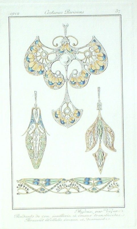 Eau forte authentique coloriee au pochoir rehaussee a la main, sur papier velin verge de Hollande filigrane : edition du journal des dames et des modes costumes parisiens fonde en 1797 par Jean-Baptiste Selleque, et repris en 1801 par Pierre de La Mesangere : Ces toilettes et coiffes representees dressent un panel pointu du costume feminin sous le Directoire, le Consulat et l'Empire ainsi que des costumes masculins. format 120 x 220 . (tirage 1250 exemplaires numerotes) dessinateurs illustrant l'ensemble de ces oeuvres(Barbier George, Berty B, Bureau Louis, Pecoud Andre, Wegener Gerda, Baskt Leon, Brunelleschi Umberto, Damy Robert, Souef J.Renee, Rouard geo, Smith Ismael, Loeze, Gaudray d'Anjou, Metzanov Aris, Sesboue Suzanne, Lemaire Germaine, Taquoy Maurice, Simeon Fernand, Carus Arlette, Gose Javier, Drian Adrien Etienne, Lhuer Victor, Vallee Armand, Fournier Henri, Boutet de Monvel Bernard, Bussy, Broch Jan van, Vever, Legran Pierre, Franc-Nohain Madeleine (mfn)...Lorenzi Fabius, Pichenot Robert, Broders Roger, Honore H, Stefan Andre, Lemain Germaine ) Modele : Pendants de cou, joaillerie, emaux, bracelets libellules diamants